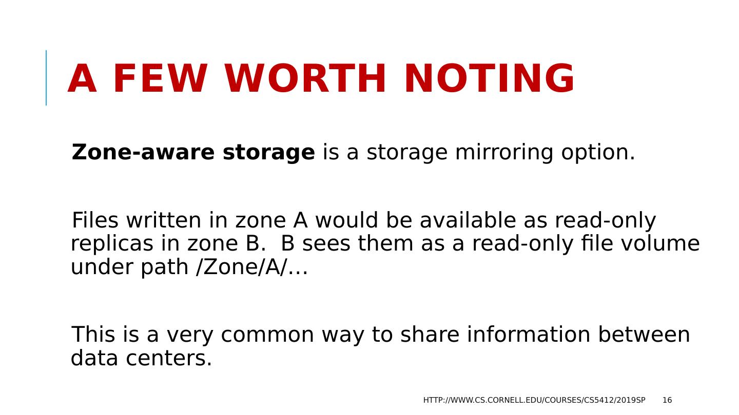 16 .A few worth noting Zone-aware storage is a storage mirroring option. Files written in zone A would be available as read-only replicas in zone B. B sees them as a read-only file volume under path /Zone/A/… This is a very common way to share information between data centers. http://www.cs.cornell.edu/courses/cs5412/2019sp 16