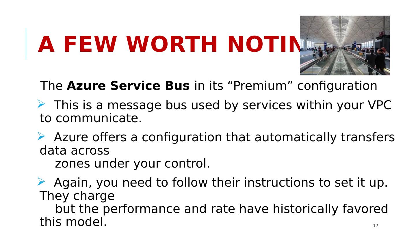 17 .A Few Worth Noting The Azure Service Bus in its “Premium” configuration This is a message bus used by services within your VPC to communicate. Azure offers a configuration that automatically transfers data across zones under your control. Again, you need to follow their instructions to set it up. They charge but the performance and rate have historically favored this model. Basically, two queues hold messages, and then they use a set of side by side TCP connections to shuttle data in both directions. Very efficient! 17
