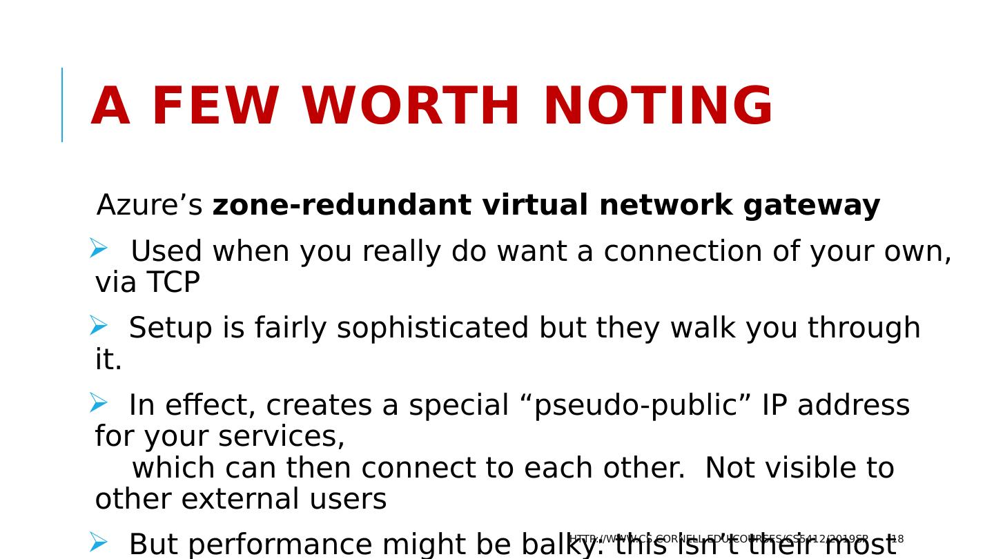 18 .A Few Worth Noting Azure’s zone-redundant virtual network gateway Used when you really do want a connection of your own, via TCP Setup is fairly sophisticated but they walk you through it. In effect, creates a special “pseudo-public” IP address for your services, which can then connect to each other. Not visible to other external users But performance might be balky: this isn’t their most performant option. And they charge by the megabyte transferred over the links. http://www.cs.cornell.edu/courses/cs5412/2019sp 18