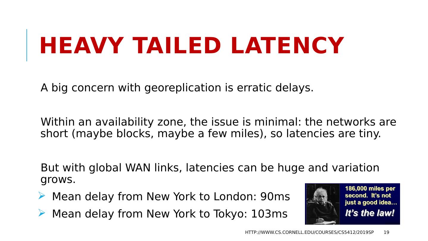 19 .Heavy tailed Latency A big concern with georeplication is erratic delays. Within an availability zone, the issue is minimal: the networks are short (maybe blocks, maybe a few miles), so latencies are tiny. But with global WAN links, latencies can be huge and variation grows. Mean delay from New York to London: 90ms Mean delay from New York to Tokyo: 103ms http://www.cs.cornell.edu/courses/cs5412/2019sp 19