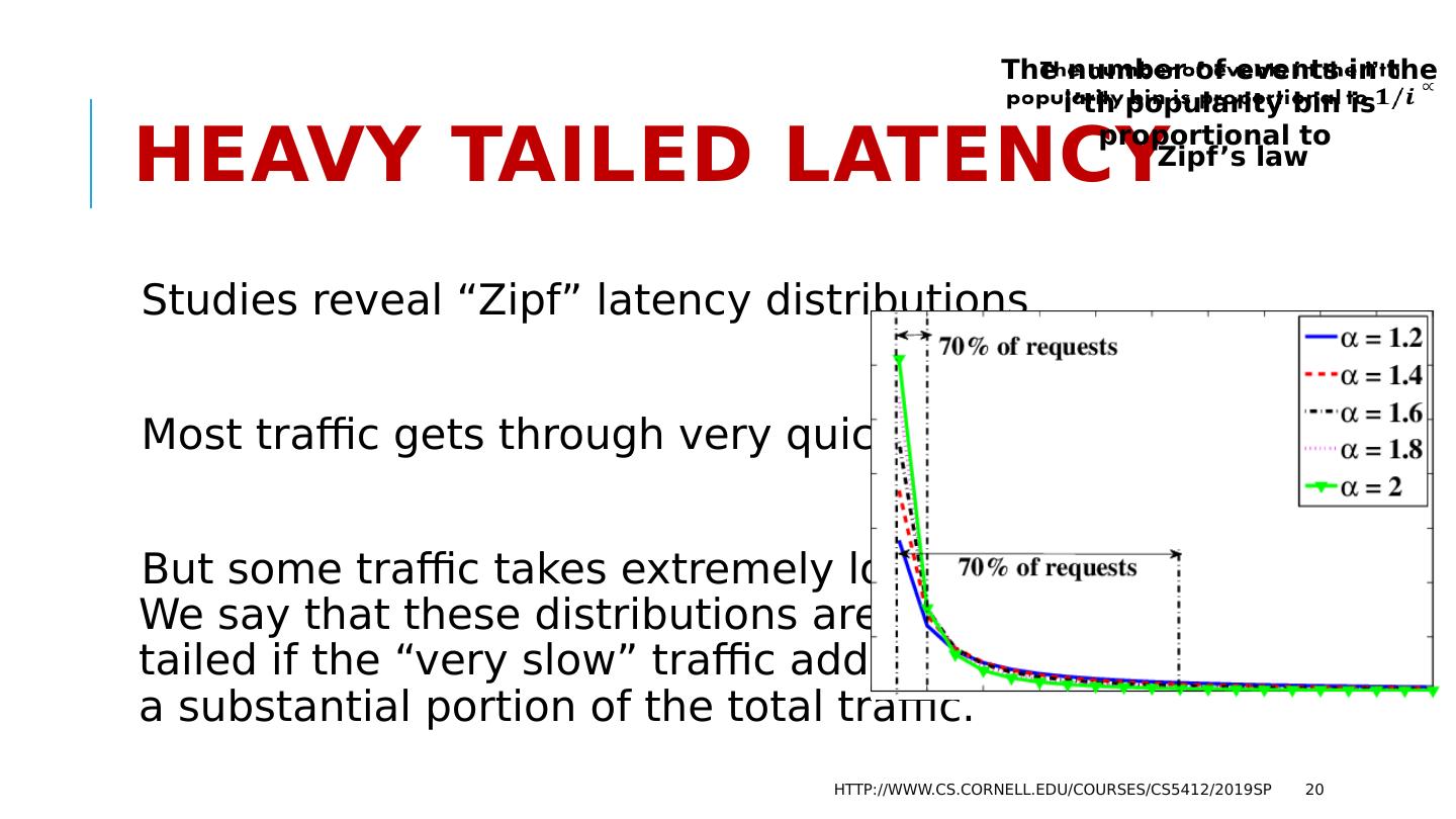 20 .Heavy Tailed Latency Studies reveal “ Zipf ” latency distributions Most traffic gets through very quickly But some traffic takes extremely long. We say that these distributions are heavy- tailed if the “very slow” traffic adds up to a substantial portion of the total traffic. http://www.cs.cornell.edu/courses/cs5412/2019sp 20 Zipf’s law The number of events in the i’th popularity bin is proportional to