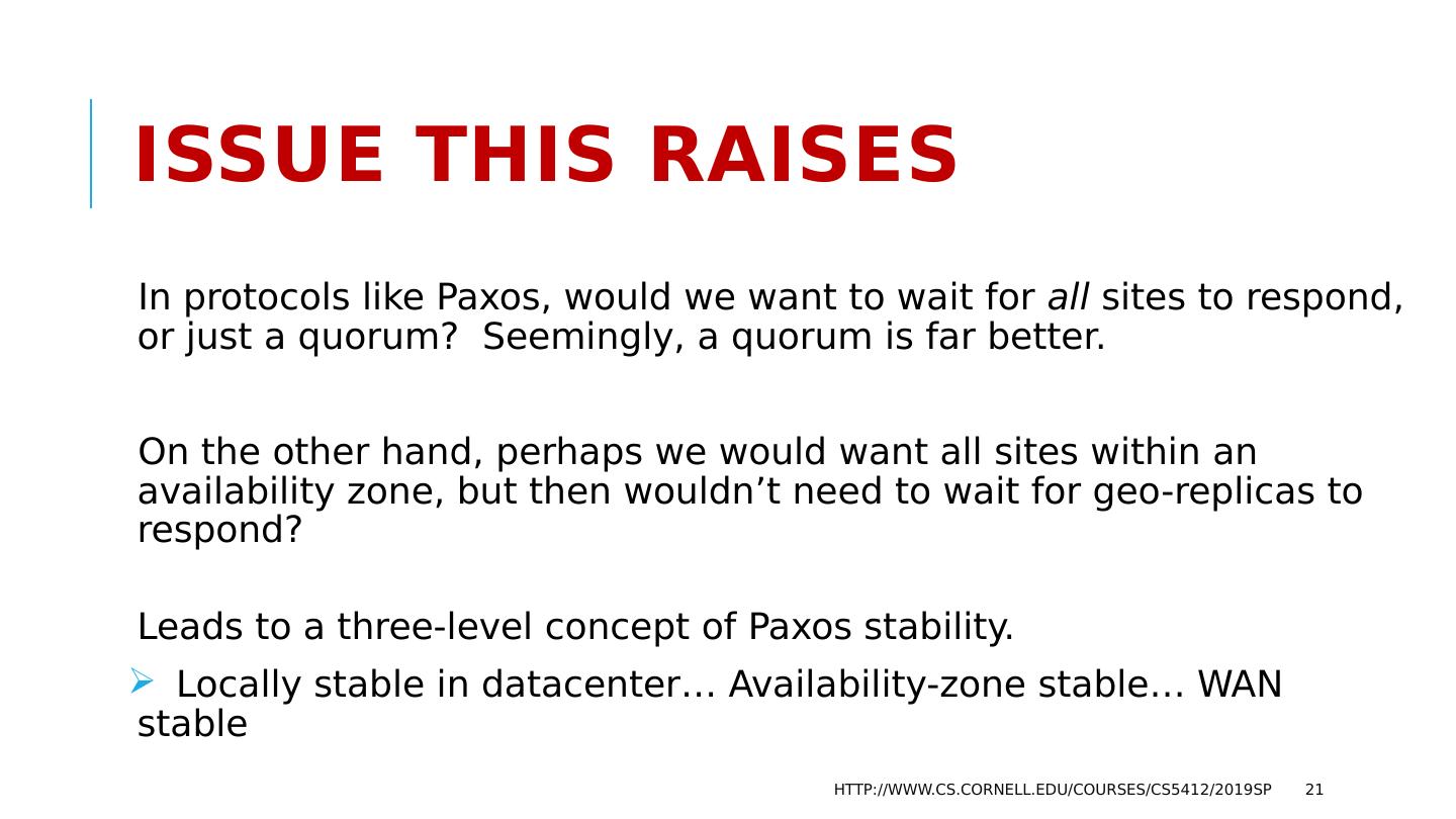 21 .Issue this raises In protocols like Paxos , would we want to wait for all sites to respond, or just a quorum? Seemingly, a quorum is far better. On the other hand, perhaps we would want all sites within an availability zone, but then wouldn’t need to wait for geo-replicas to respond? Leads to a three-level concept of Paxos stability. Locally stable in datacenter… Availability-zone stable… WAN stable http://www.cs.cornell.edu/courses/cs5412/2019sp 21