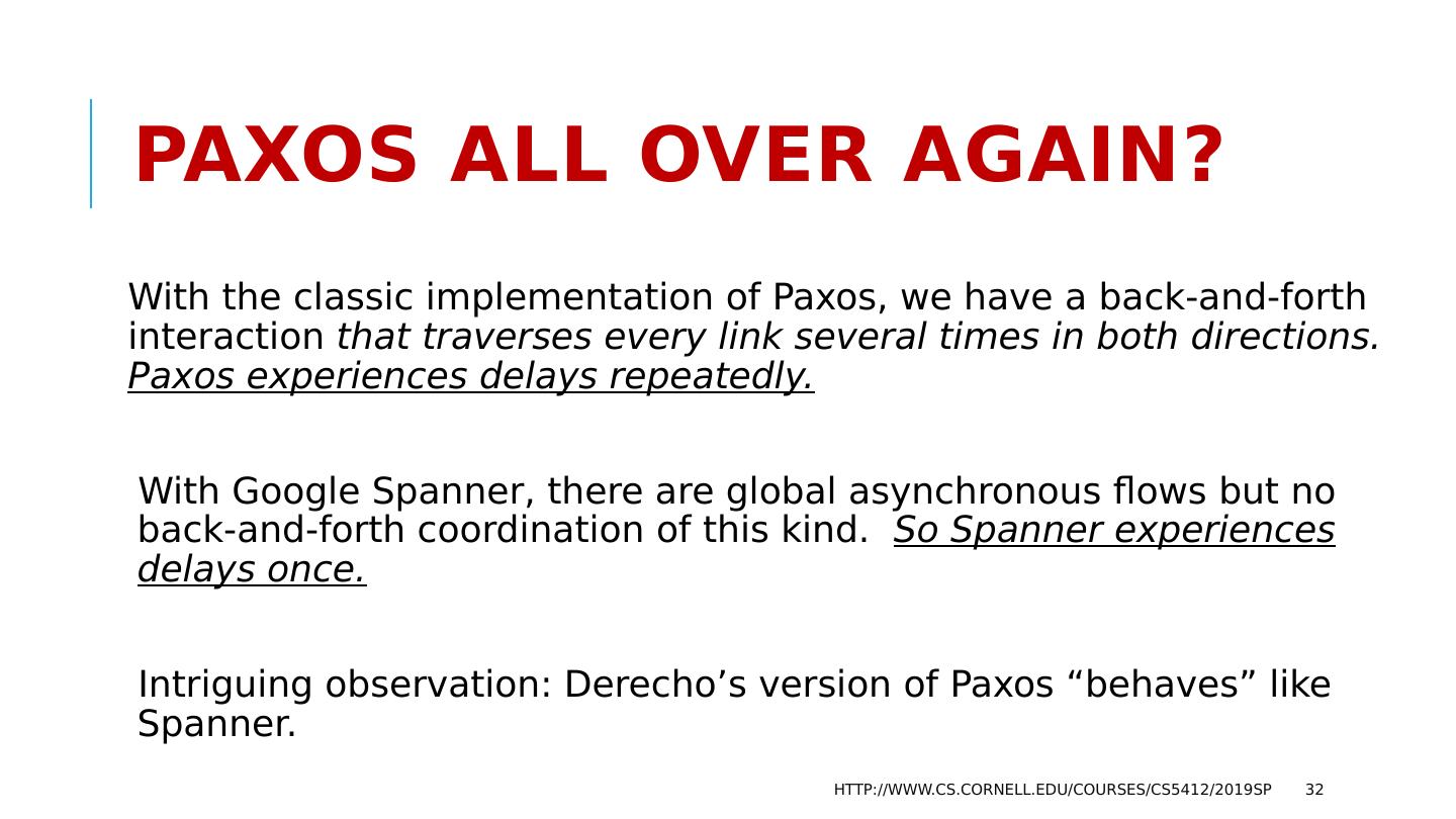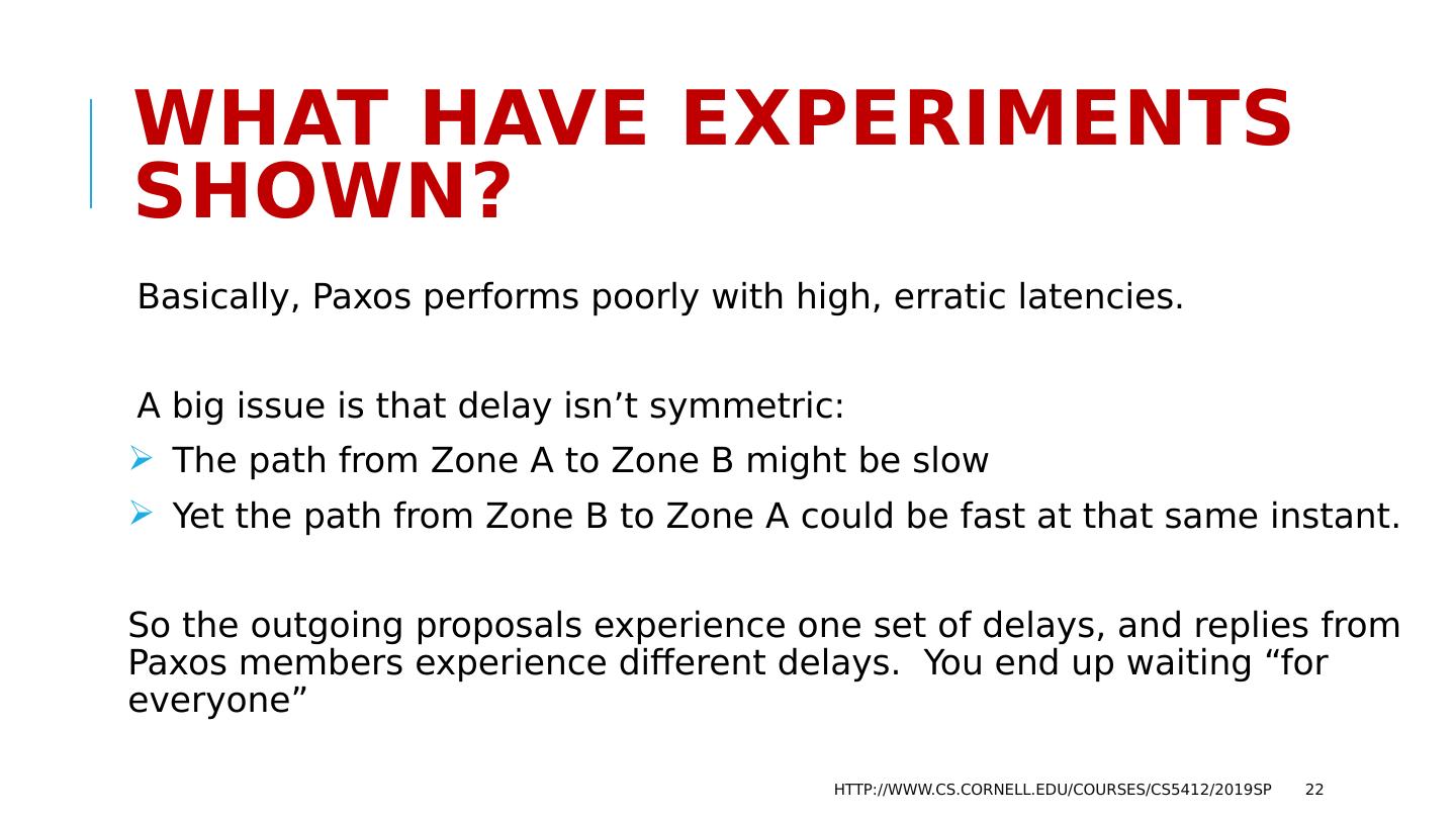 22 .What have experiments shown? Basically, Paxos performs poorly with high, erratic latencies. A big issue is that delay isn’t symmetric: The path from Zone A to Zone B might be slow Yet the path from Zone B to Zone A could be fast at that same instant. So the outgoing proposals experience one set of delays, and replies from Paxos members experience different delays. You end up waiting “for everyone” http://www.cs.cornell.edu/courses/cs5412/2019sp 22