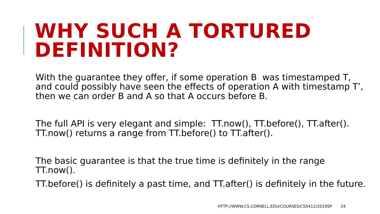 24 .Why such a tortured definition? With the guarantee they offer, if some operation B was timestamped T, and could possibly have seen the effects of operation A with timestamp T’, then we can order B and A so that A occurs before B. The full API is very elegant and simple: TT.now (), TT.before (), TT.after (). TT.now () returns a range from TT.before () to TT.after (). The basic guarantee is that the true time is definitely in the range TT.now (). TT.before () is definitely a past time, and TT.after () is definitely in the future. http://www.cs.cornell.edu/courses/cs5412/2019sp 24