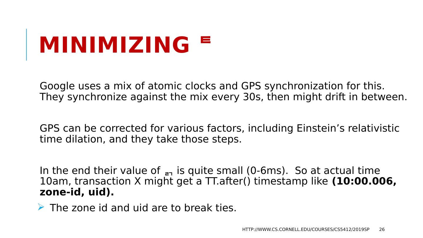 26 .Minimizing Google uses a mix of atomic clocks and GPS synchronization for this. They synchronize against the mix every 30s, then might drift in between. GPS can be corrected for various factors, including Einstein’s relativistic time dilation, and they take those steps. In the end their value of is quite small (0-6ms). So at actual time 10am, transaction X might get a TT.after () timestamp like (10:00.006, zone-id, uid ). The zone id and uid are to break ties. http://www.cs.cornell.edu/courses/cs5412/2019sp 26