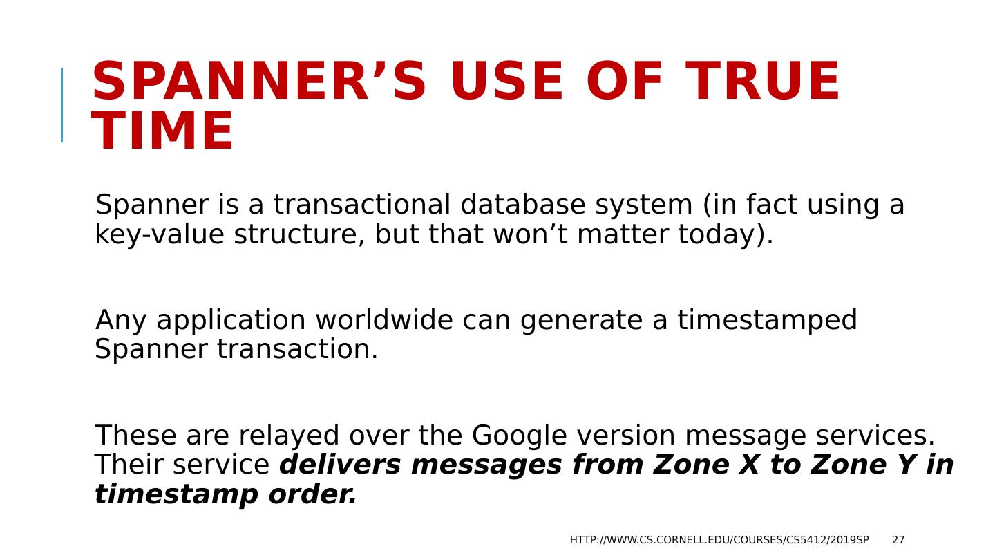 27 .Spanner’s use of True Time Spanner is a transactional database system (in fact using a key-value structure, but that won’t matter today). Any application worldwide can generate a timestamped Spanner transaction. These are relayed over the Google version message services. Their service delivers messages from Zone X to Zone Y in timestamp order. http://www.cs.cornell.edu/courses/cs5412/2019sp 27