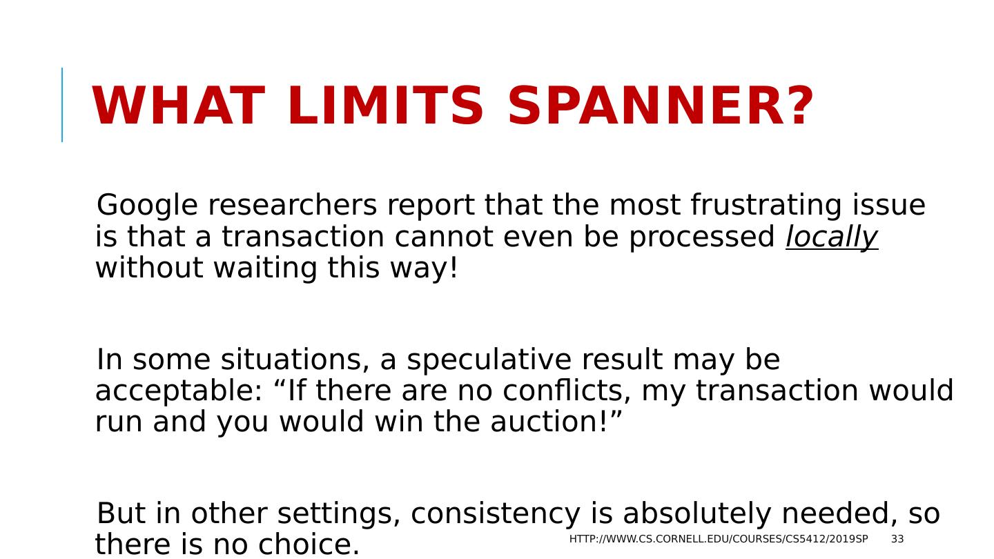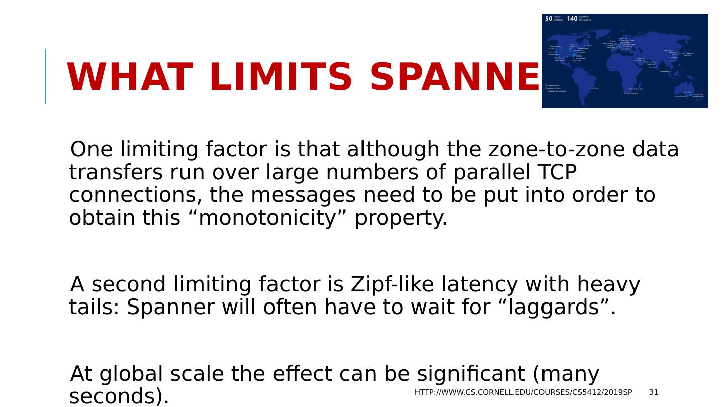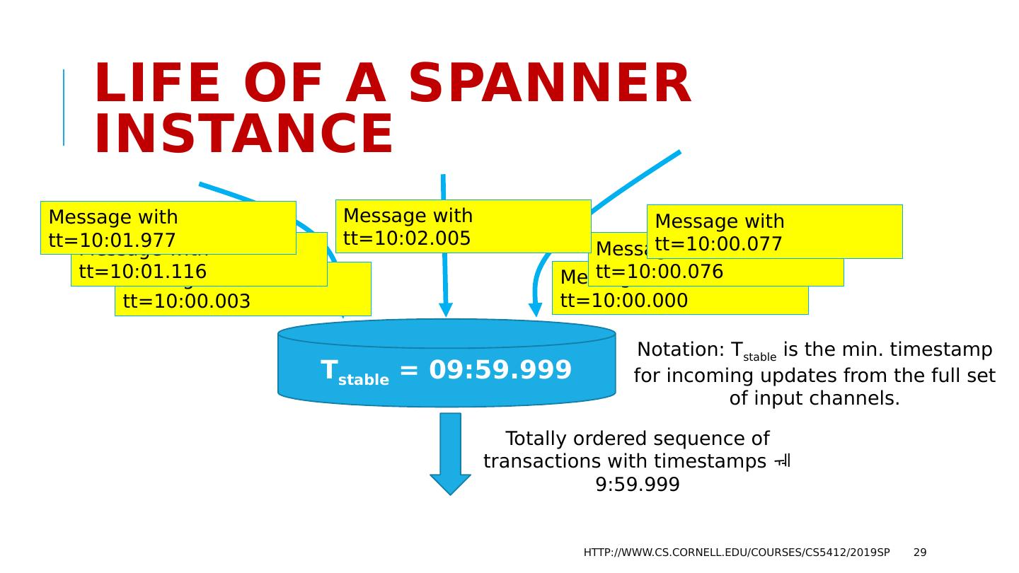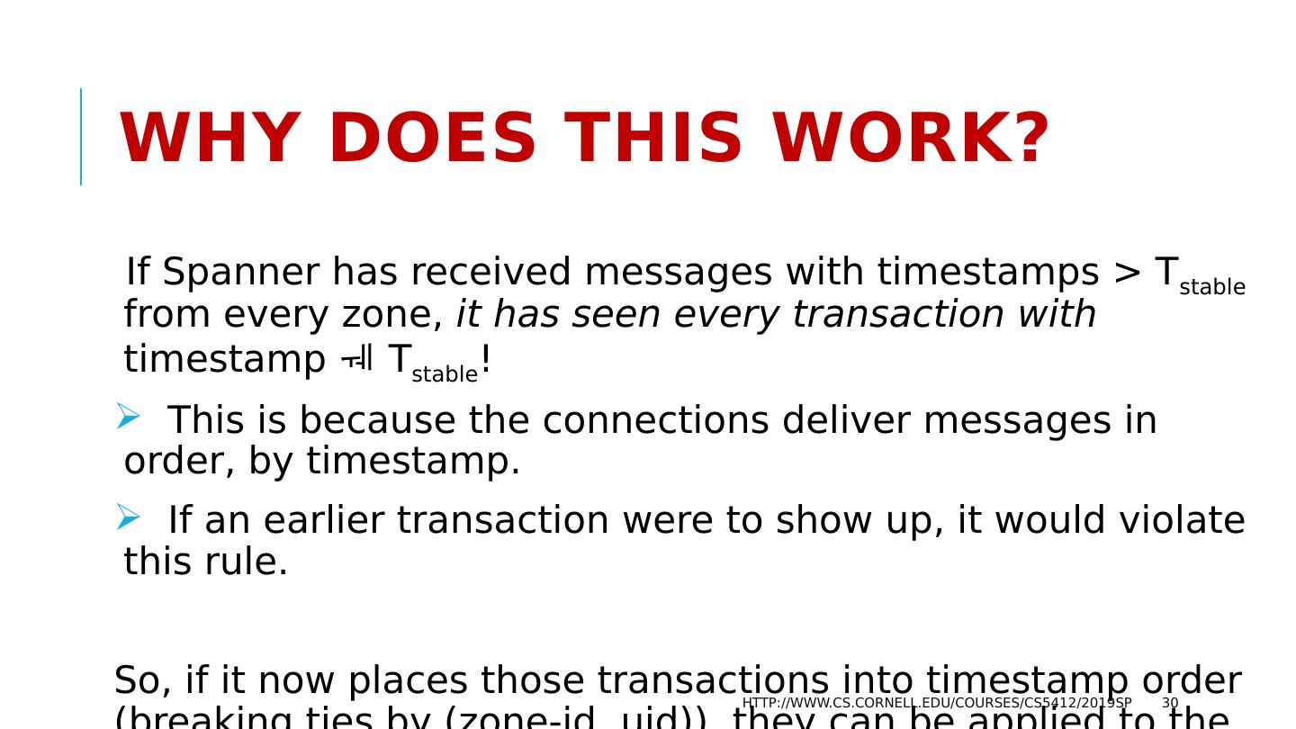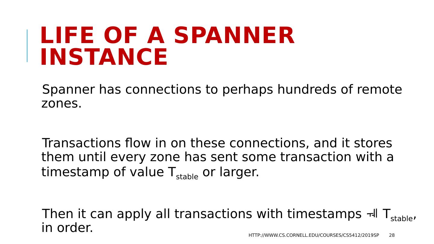 28 .Life of a Spanner Instance Spanner has connections to perhaps hundreds of remote zones. Transactions flow in on these connections, and it stores them until every zone has sent some transaction with a timestamp of value T stable or larger. Then it can apply all transactions with timestamps T stable , in order. http://www.cs.cornell.edu/courses/cs5412/2019sp 28