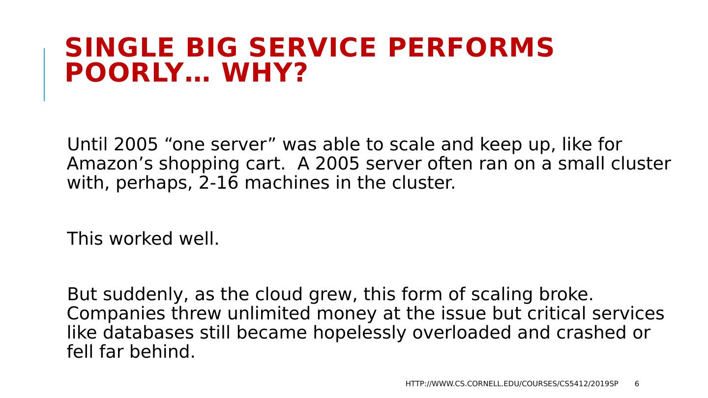 7 .Single big service performs poorly… why? Until 2005 “one server” was able to scale and keep up, like for Amazon’s shopping cart . A 2005 server often ran on a small cluster with, perhaps, 2-16 machines in the cluster. This worked well. But suddenly, as the cloud grew, this form of scaling broke. Companies threw unlimited money at the issue but critical services like databases still became hopelessly overloaded and crashed or fell far behind. http://www.cs.cornell.edu/courses/cs5412/2019sp 6