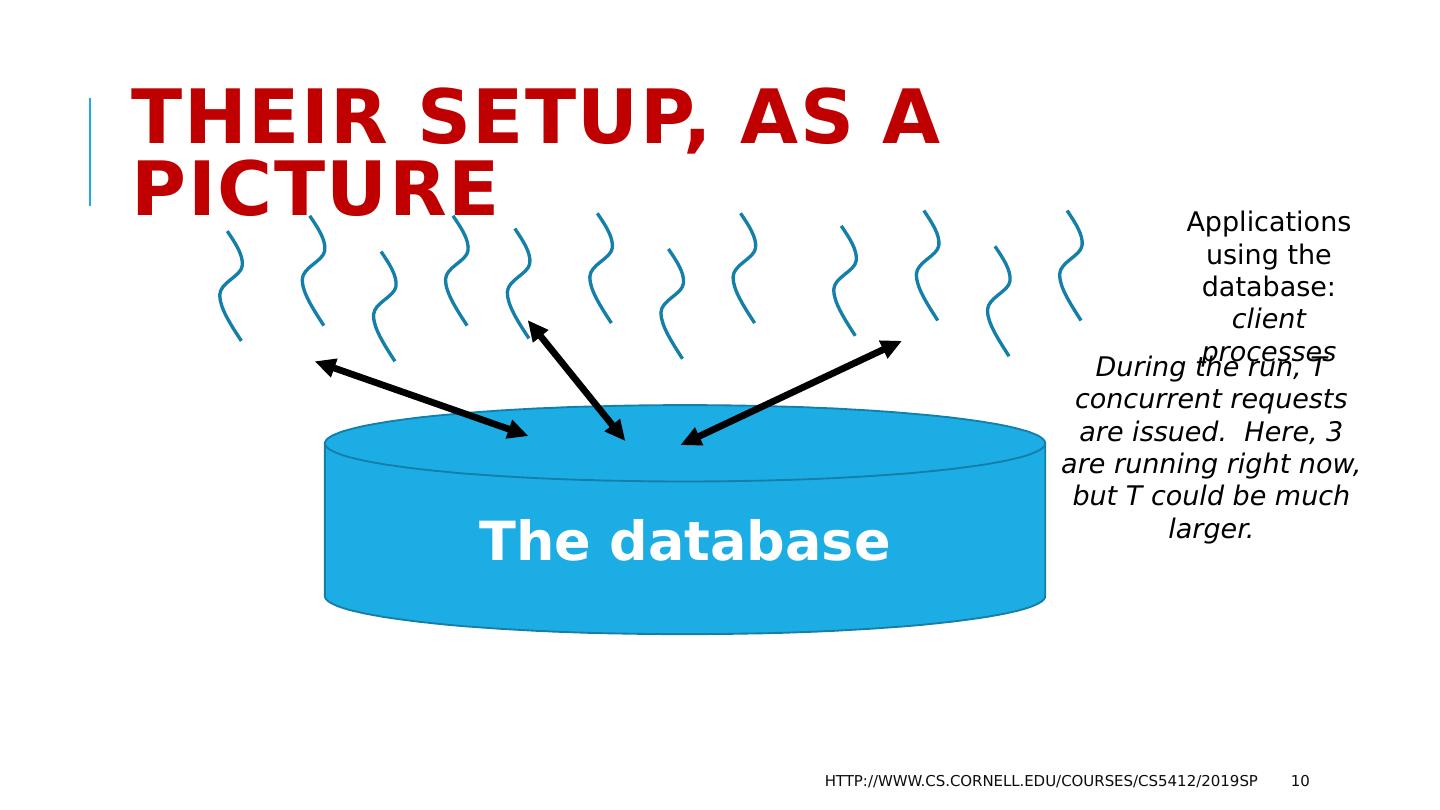 10 .Their setup, as a picture http://www.cs.cornell.edu/courses/cs5412/2019sp 10 The database Applications using the database: client processes During the run, T concurrent requests are issued. Here, 3 are running right now, but T could be much larger.