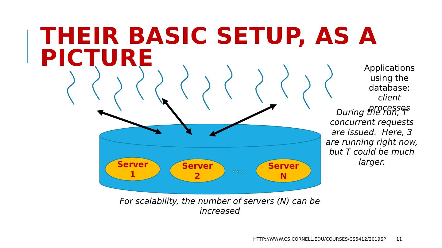 11 .Their Basic setup, as a picture http://www.cs.cornell.edu/courses/cs5412/2019sp 11 For scalability, the number of servers (N) can be increased Server 1 Server 2 Server N Applications using the database: client processes During the run, T concurrent requests are issued. Here, 3 are running right now, but T could be much larger.