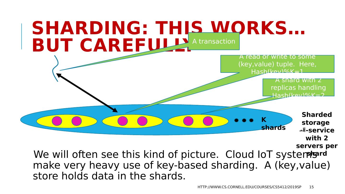 15 .Sharding : This works… but carefully We will often see this kind of picture. Cloud IoT systems make very heavy use of key-based sharding . A ( key,value ) store holds data in the shards. http://www.cs.cornell.edu/courses/cs5412/2019sp 15 Sharded storage - service with 2 servers per shard A shard with 2 replicas handling Hash(key)%K=2 A transaction A read or write to some ( key,value ) tuple. Here, Hash(key)%K=1 K shards