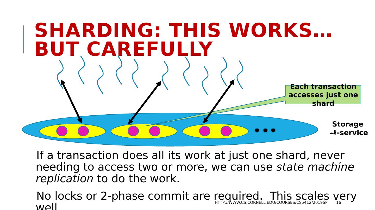 16 .Sharding : This works… but carefully If a transaction does all its work at just one shard, never needing to access two or more, we can use state machine replication to do the work. No locks or 2-phase commit are required. This scales very well. http://www.cs.cornell.edu/courses/cs5412/2019sp 16 Storage - service Each transaction accesses just one shard