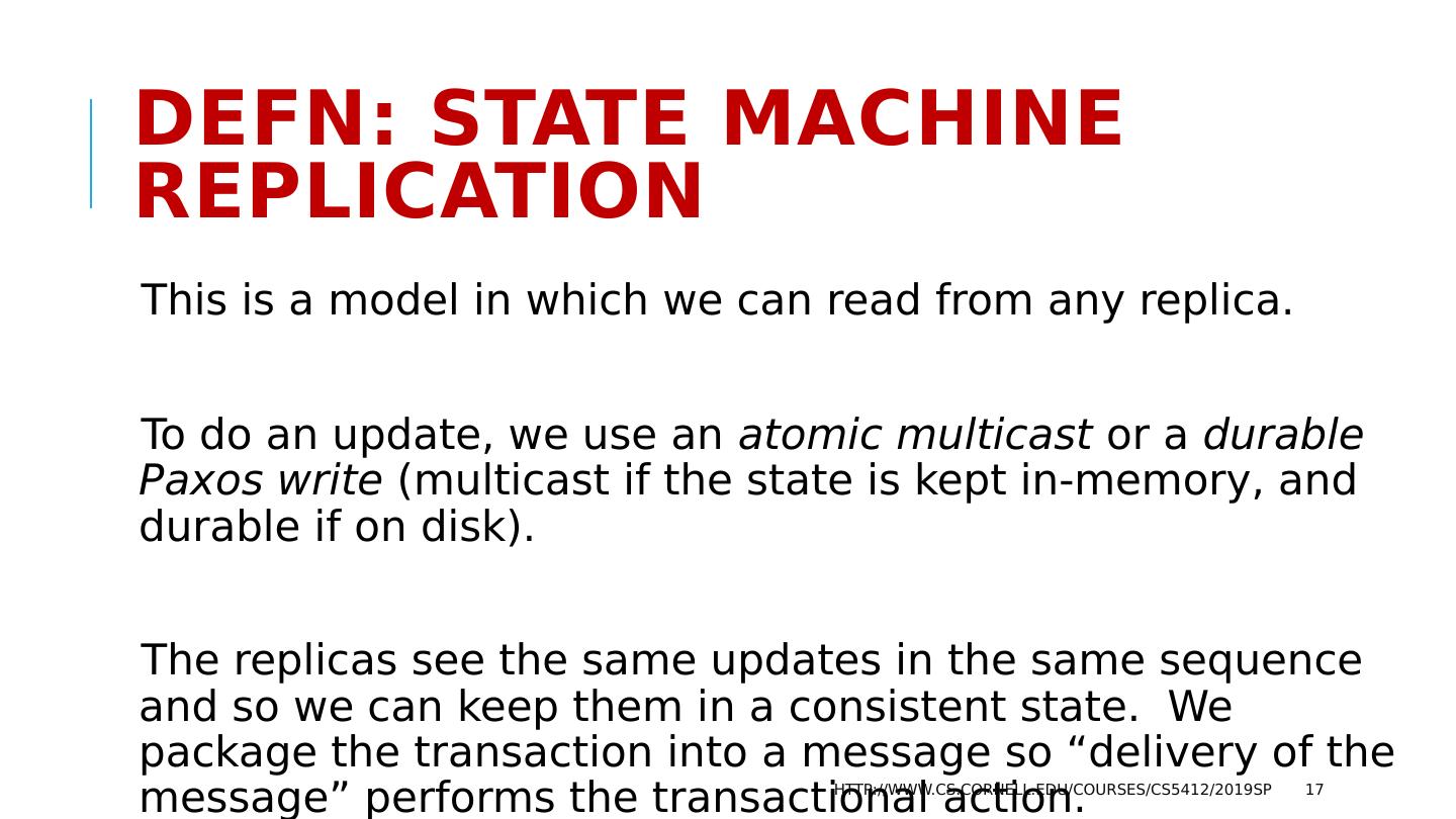 17 .DefN : State Machine Replication This is a model in which we can read from any replica. To do an update, we use an atomic multicast or a durable Paxos write (multicast if the state is kept in-memory, and durable if on disk). The replicas see the same updates in the same sequence and so we can keep them in a consistent state. We package the transaction into a message so “delivery of the message” performs the transactional action. http://www.cs.cornell.edu/courses/cs5412/2019sp 17