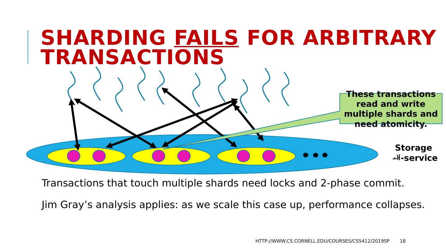 18 .Sharding fails for arbitrary transactions Transactions that touch multiple shards need locks and 2-phase commit. Jim Gray’s analysis applies: as we scale this case up, performance collapses. http://www.cs.cornell.edu/courses/cs5412/2019sp 18 Storage - service These transactions read and write multiple shards and need atomicity.