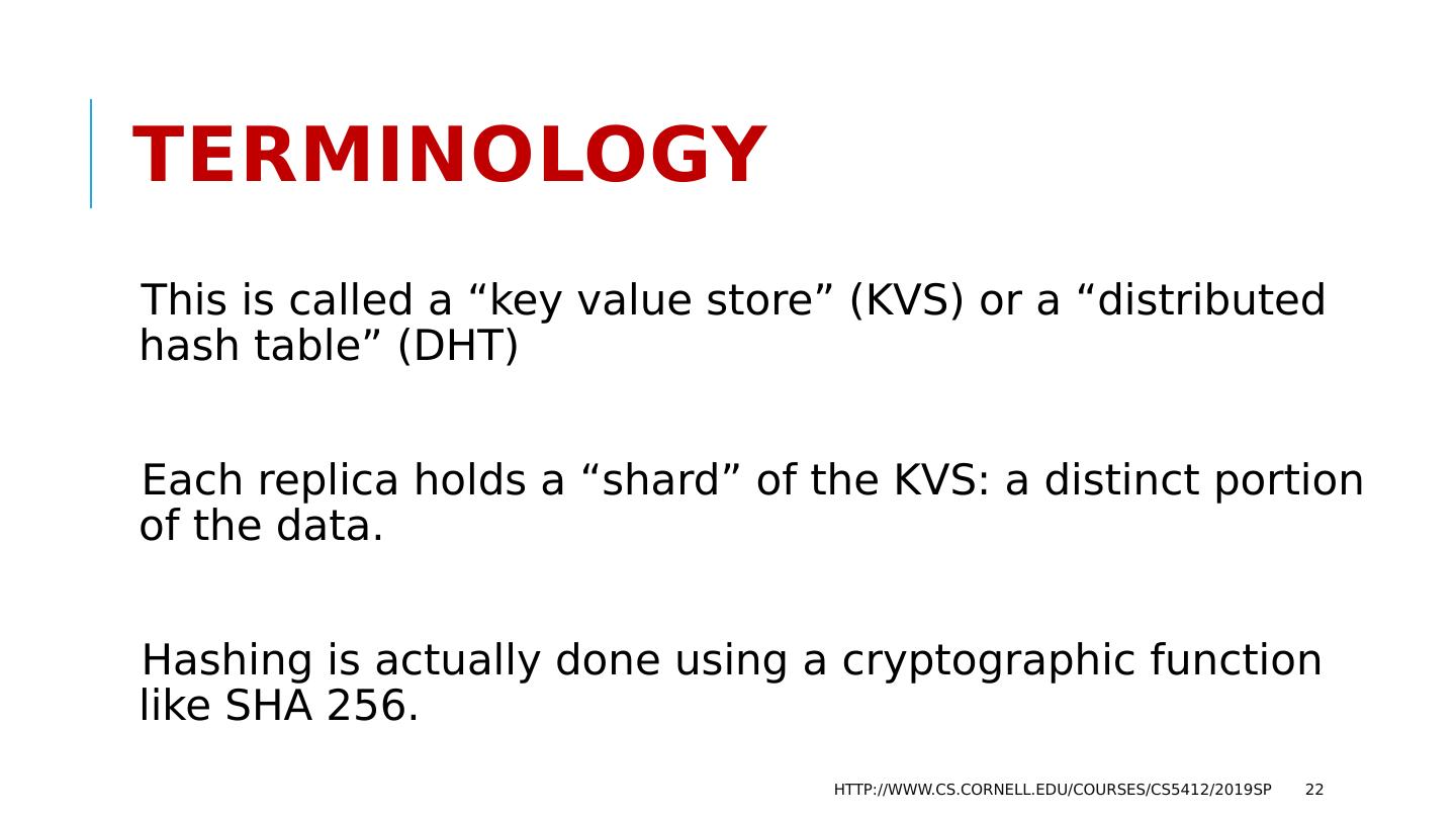 22 .Terminology This is called a “key value store” (KVS) or a “distributed hash table” (DHT) Each replica holds a “shard” of the KVS: a distinct portion of the data. Hashing is actually done using a cryptographic function like SHA 256. http://www.cs.cornell.edu/courses/cs5412/2019sp 22
