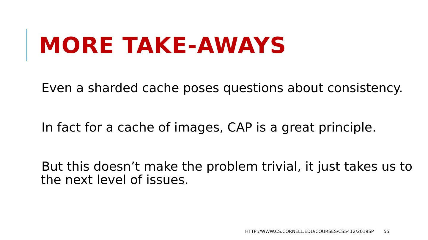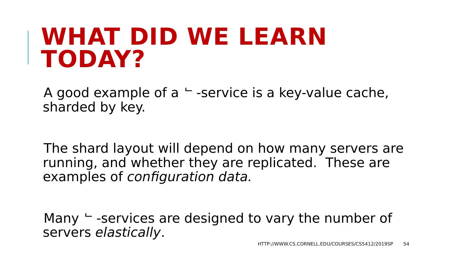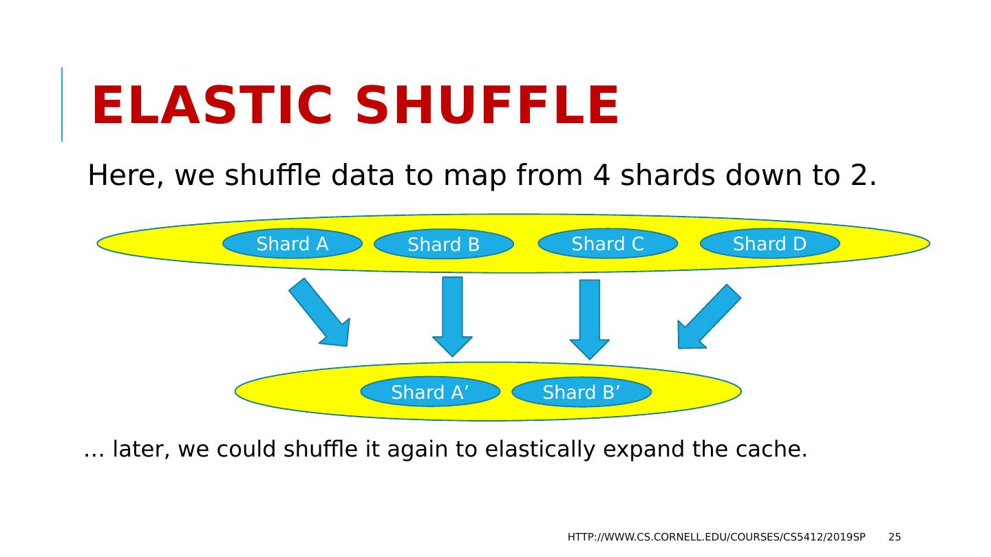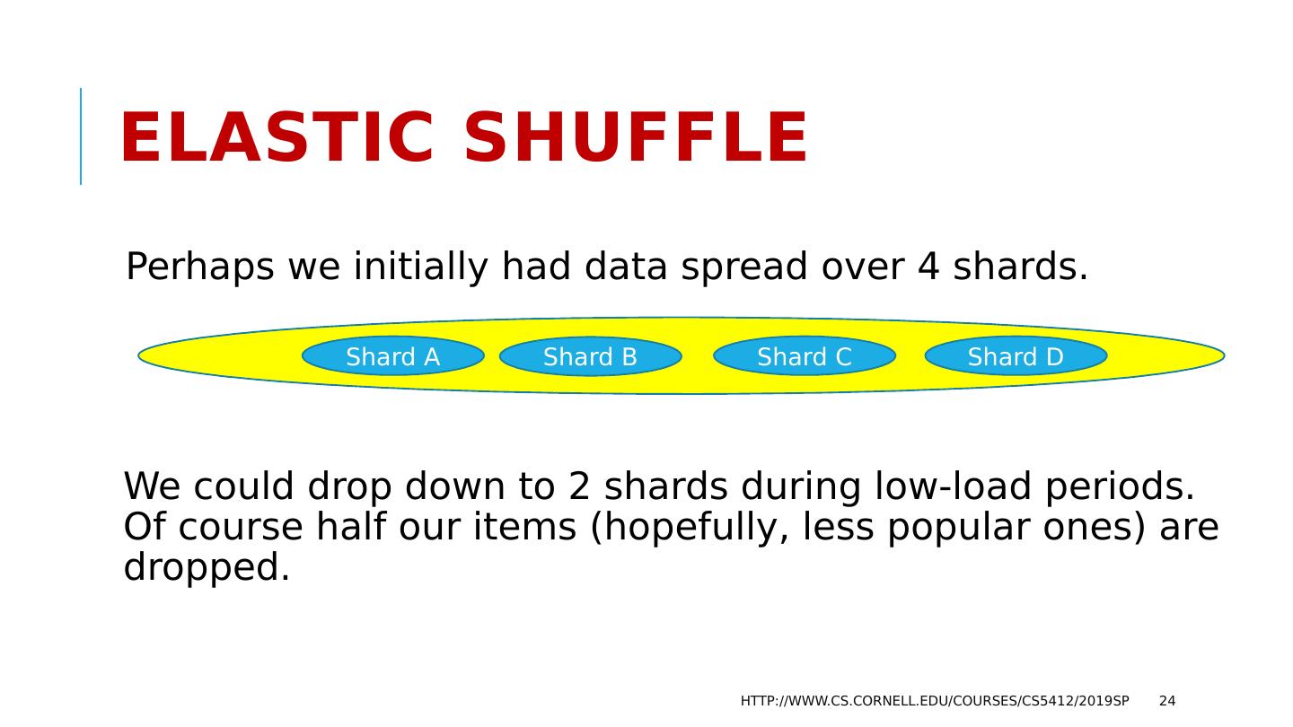 23 .Elasticity Adds a Further dimension If we expect changing patterns of load, the cache may need a way to dynamically change the pattern of sharding . Since a cache “works” even if empty, we could simply shut it down and restart with some other number of servers and some other sharding policy. But cold caches perform very badly. Instead, we would ideally “shuffle” data. http://www.cs.cornell.edu/courses/cs5412/2019sp 23