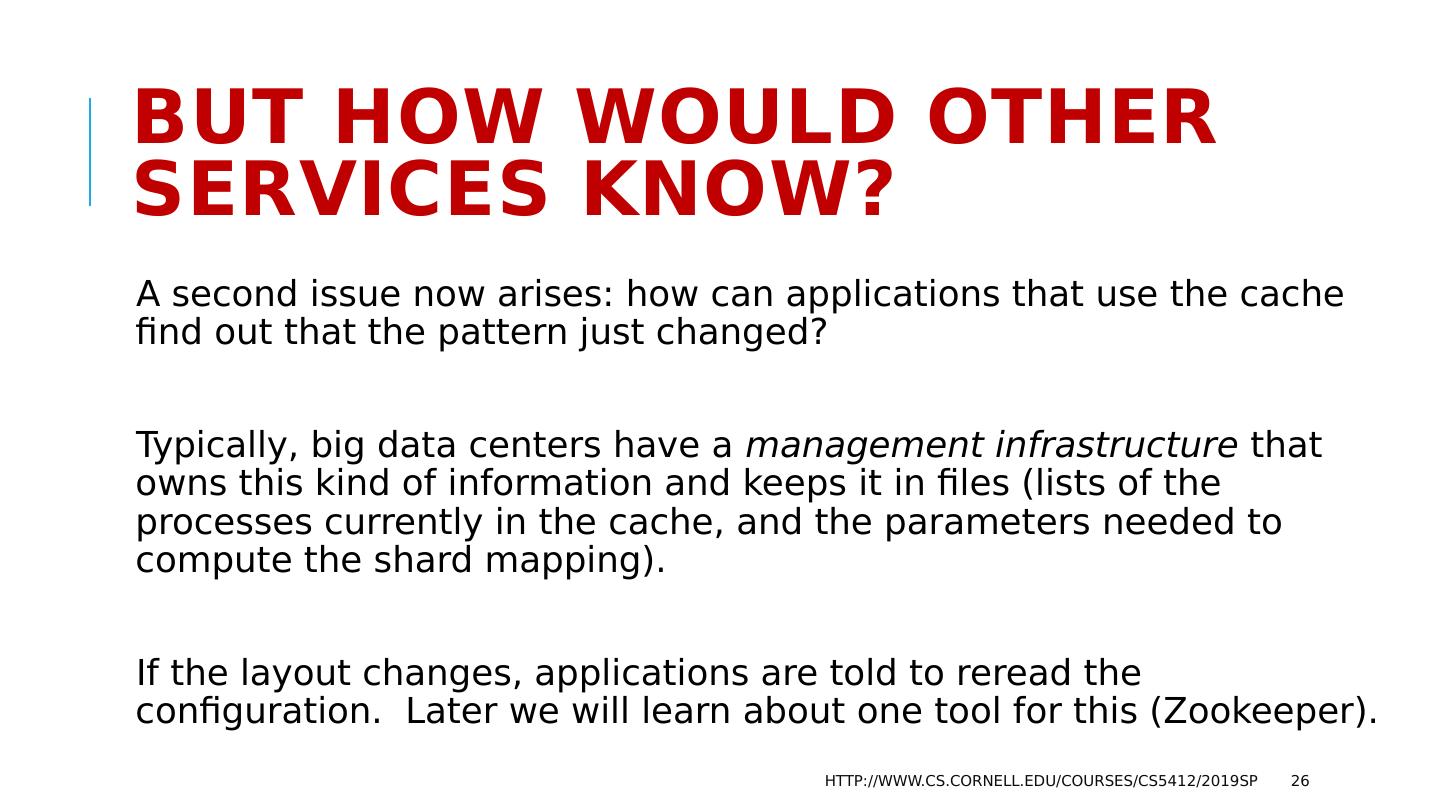 26 .But how would other services know? A second issue now arises: how can applications that use the cache find out that the pattern just changed? Typically, big data centers have a management infrastructure that owns this kind of information and keeps it in files (lists of the processes currently in the cache, and the parameters needed to compute the shard mapping). If the layout changes, applications are told to reread the configuration. Later we will learn about one tool for this (Zookeeper). http://www.cs.cornell.edu/courses/cs5412/2019sp 26