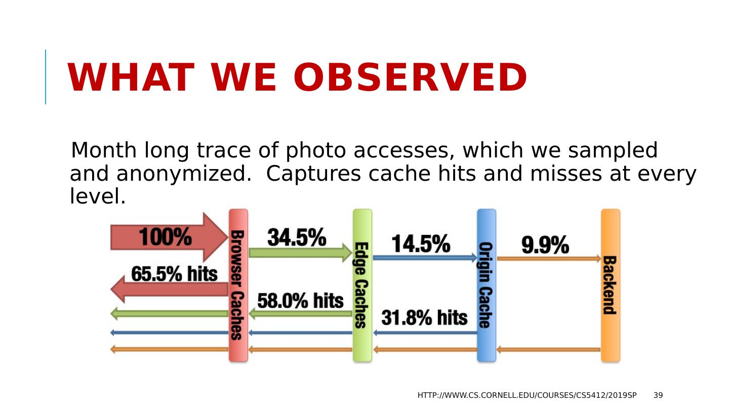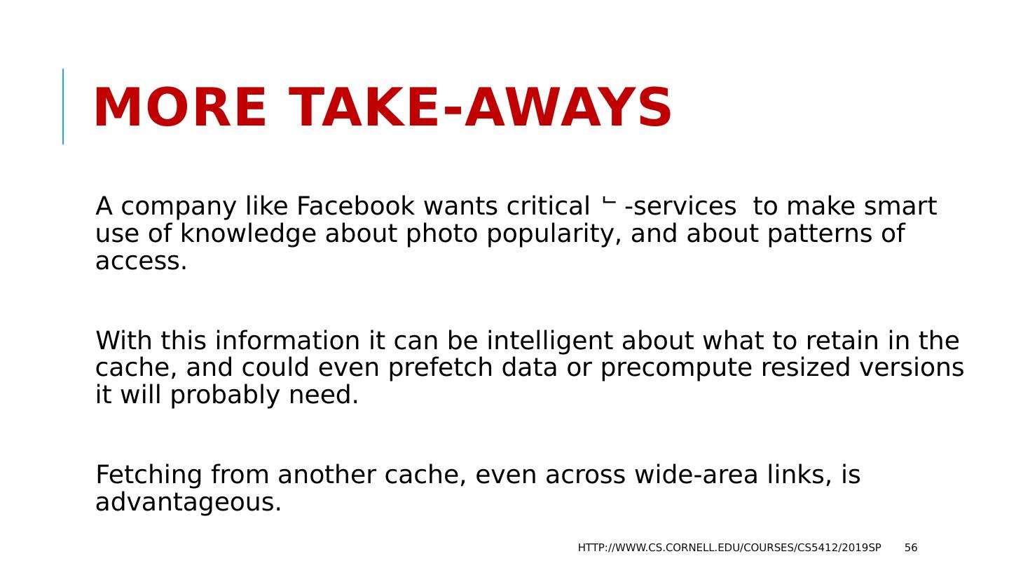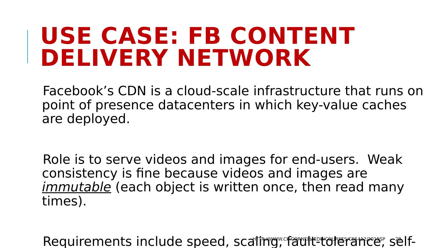 28 .Use case: FB Content Delivery Network Facebook’s CDN is a cloud-scale infrastructure that runs on point of presence datacenters in which key-value caches are deployed. Role is to serve videos and images for end-users. Weak consistency is fine because videos and images are immutable (each object is written once, then read many times). Requirements include speed, scaling, fault-tolerance, self-management http://www.cs.cornell.edu/courses/cs5412/2019sp 28