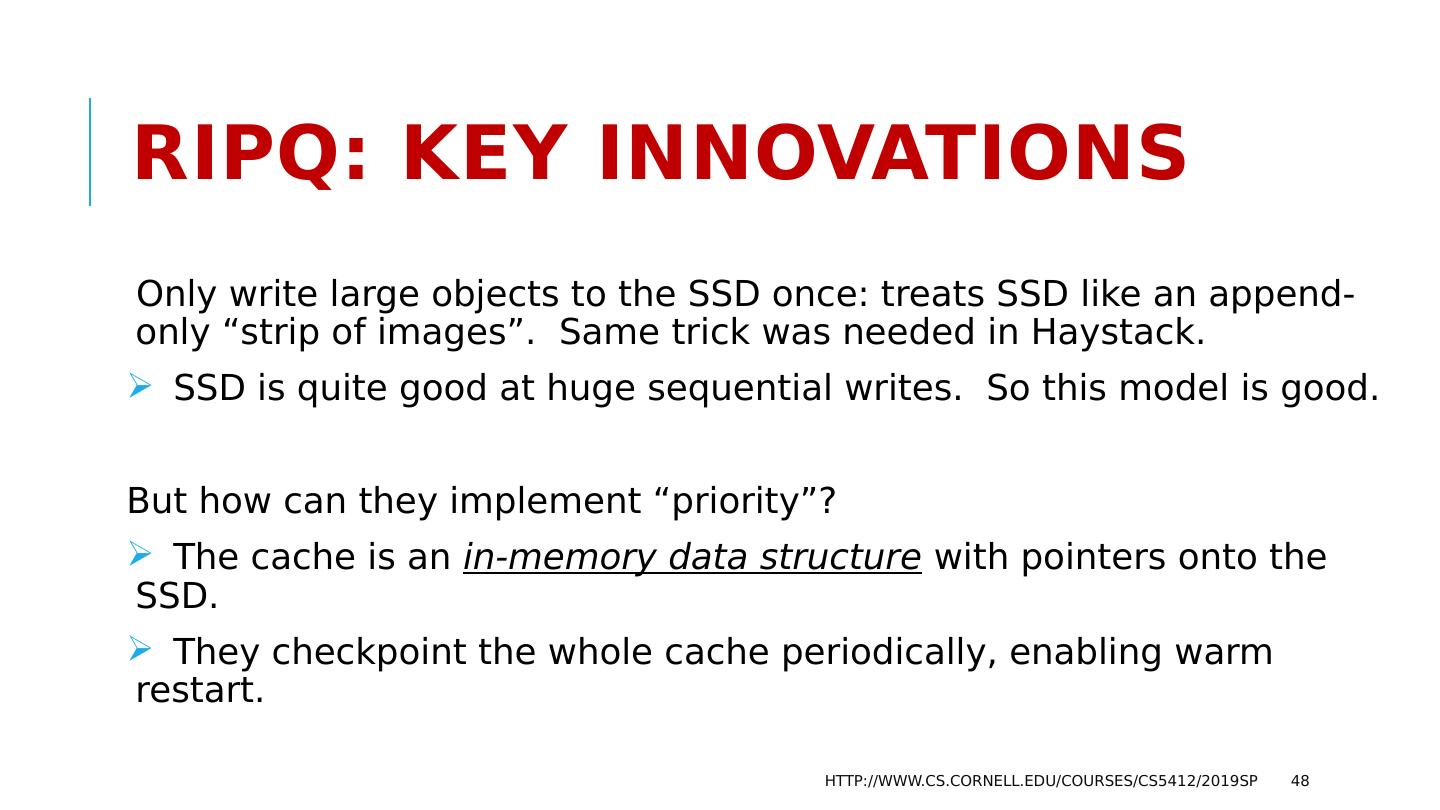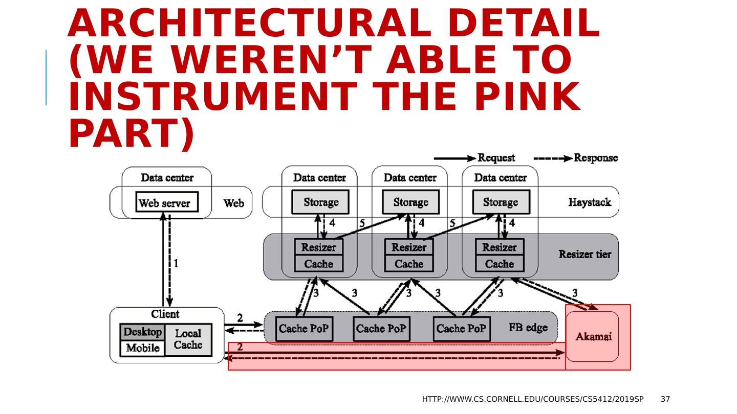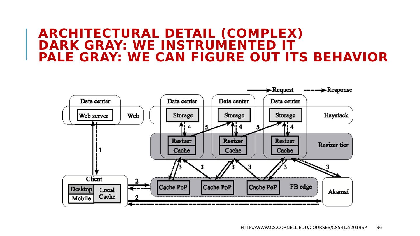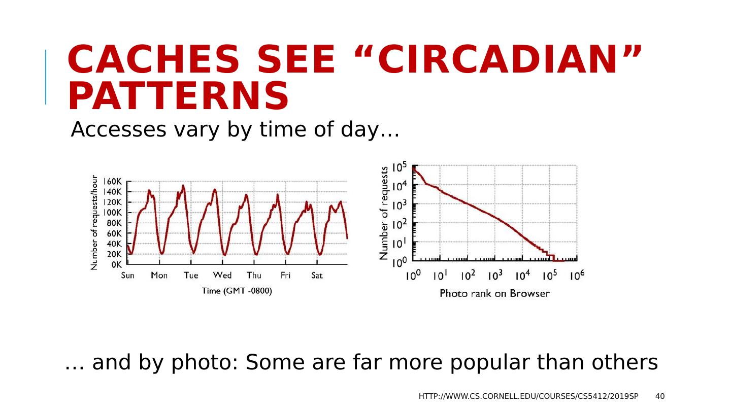 28 .Use case: FB Content Delivery Network Facebook’s CDN is a cloud-scale infrastructure that runs on point of presence datacenters in which key-value caches are deployed. Role is to serve videos and images for end-users. Weak consistency is fine because videos and images are immutable (each object is written once, then read many times). Requirements include speed, scaling, fault-tolerance, self-management http://www.cs.cornell.edu/courses/cs5412/2019sp 28
