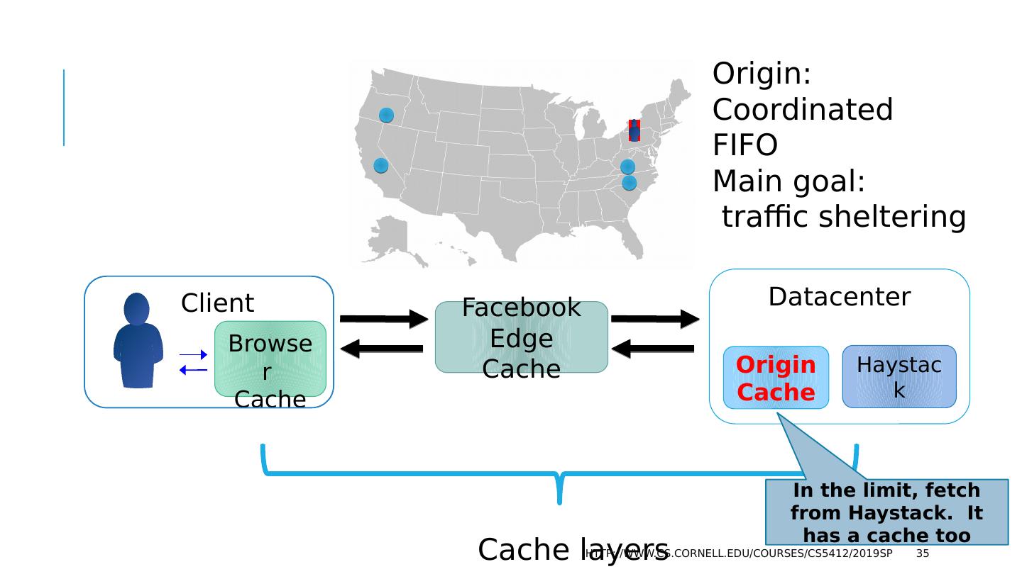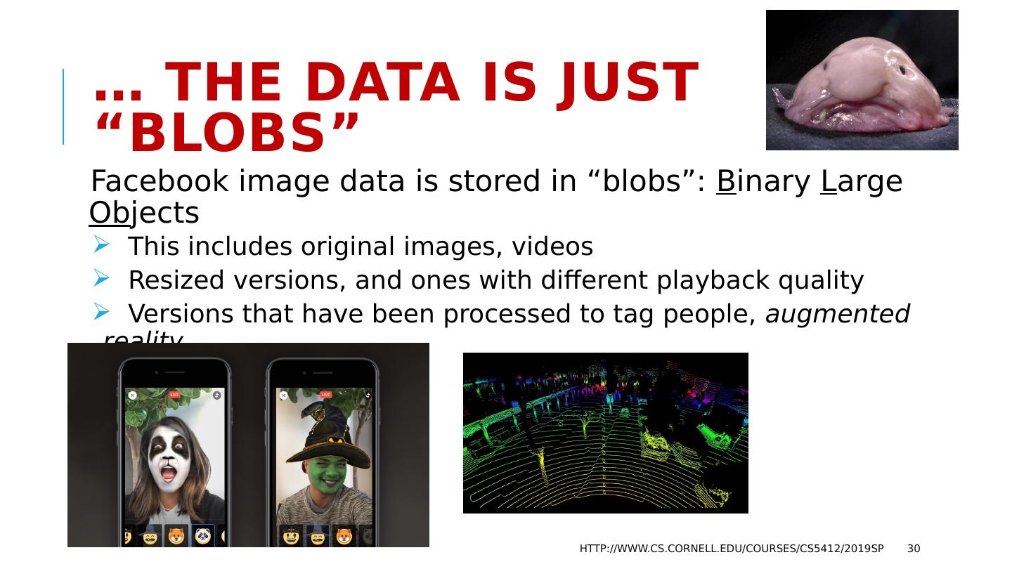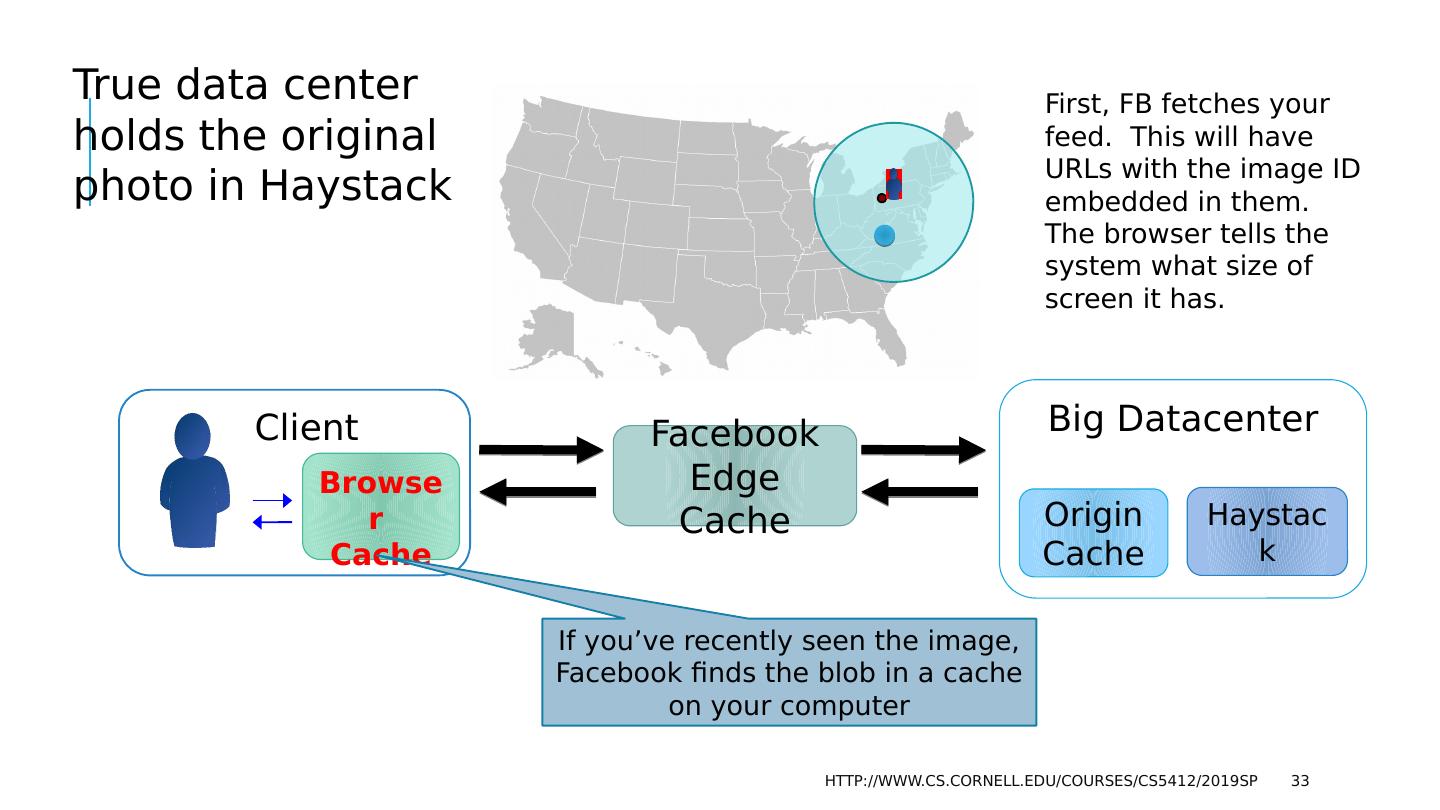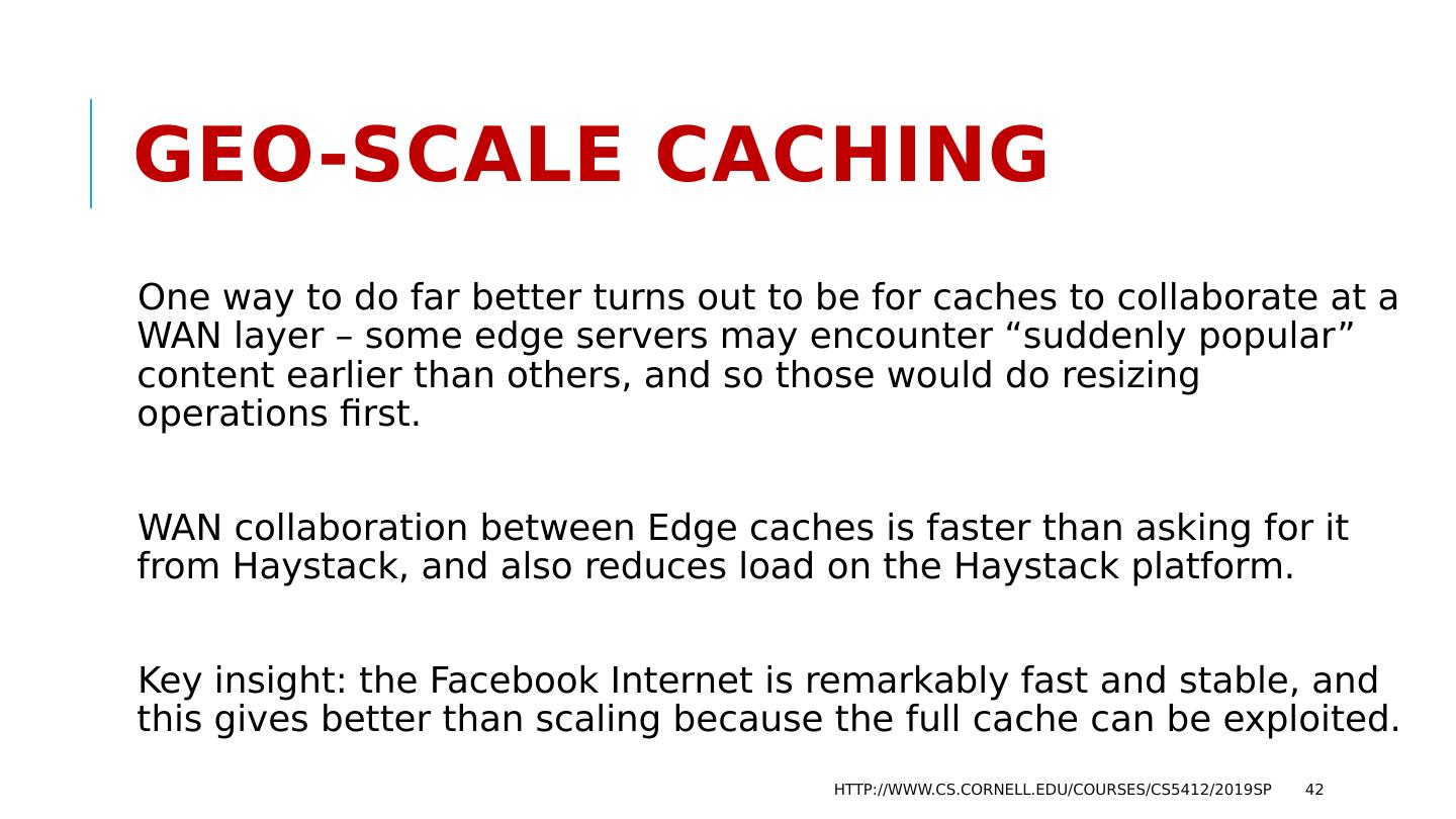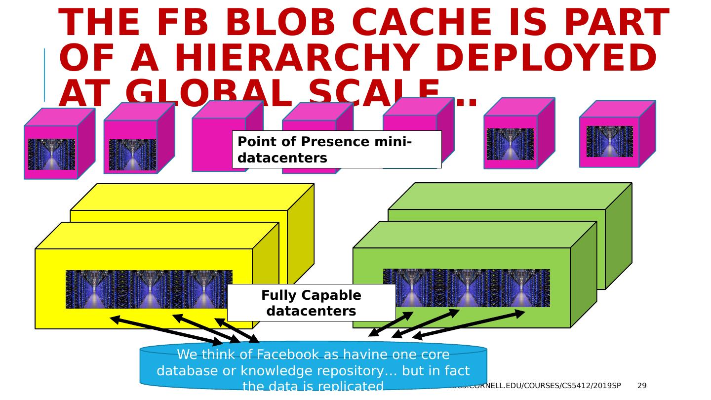 29 .The FB BLOB cache is part of A hierarchy deployed at global scale… http://www.cs.cornell.edu/courses/cs5412/2019sp 29 We think of Facebook as havine one core database or knowledge repository… but in fact the data is replicated Point of Presence mini-datacenters Fully Capable datacenters