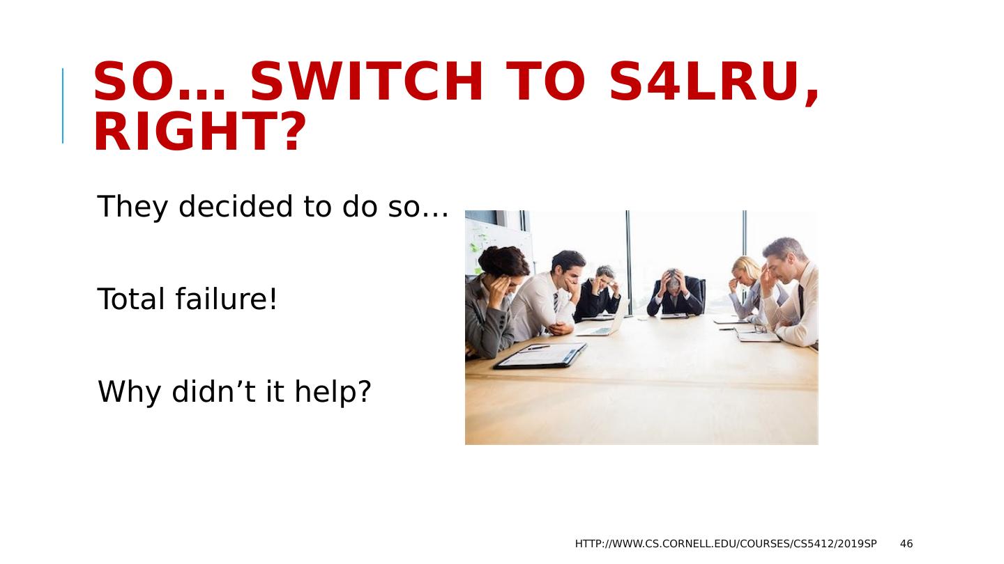 13 .Why do services slow down at scale? The paper pointed to several main issues: Lock contention. The more concurrent tasks, the more likely that they will try to access the same object (birthday paradox!) and wait for locks. Abort. Many consistency mechanisms have some form of optimistic behavior built in. Now and then, they must back out and retry. Deadlock also causes abort/retry sequences. The paper actually explores multiple options for structuring the data, but ends up with similar negative conclusions except in one specific situation. http://www.cs.cornell.edu/courses/cs5412/2019sp 13