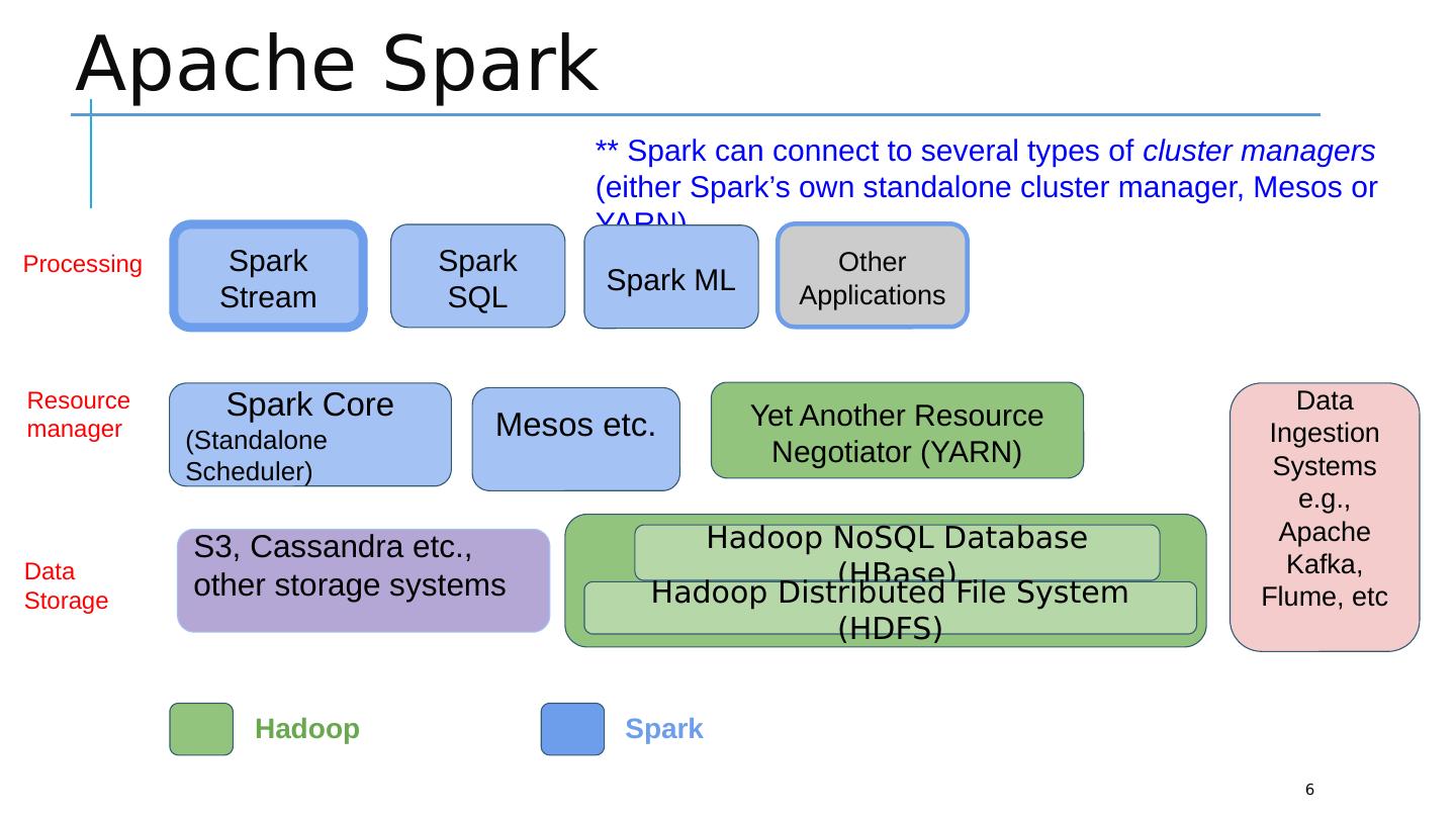 6 .Apache Spark 6 Yet Another Resource Negotiator (YARN) Spark Stream Spark SQL Other Applications Data Ingestion Systems e.g., Apache Kafka, Flume, etc Hadoop NoSQL Database (HBase) Hadoop Distributed File System (HDFS) S3, Cassandra etc., other storage systems Mesos etc. Spark Core (Standalone Scheduler) Data Storage Resource manager Hadoop Spark Processing ** Spark can connect to several types of cluster managers (either Spark’s own standalone cluster manager, Mesos or YARN) Spark ML
