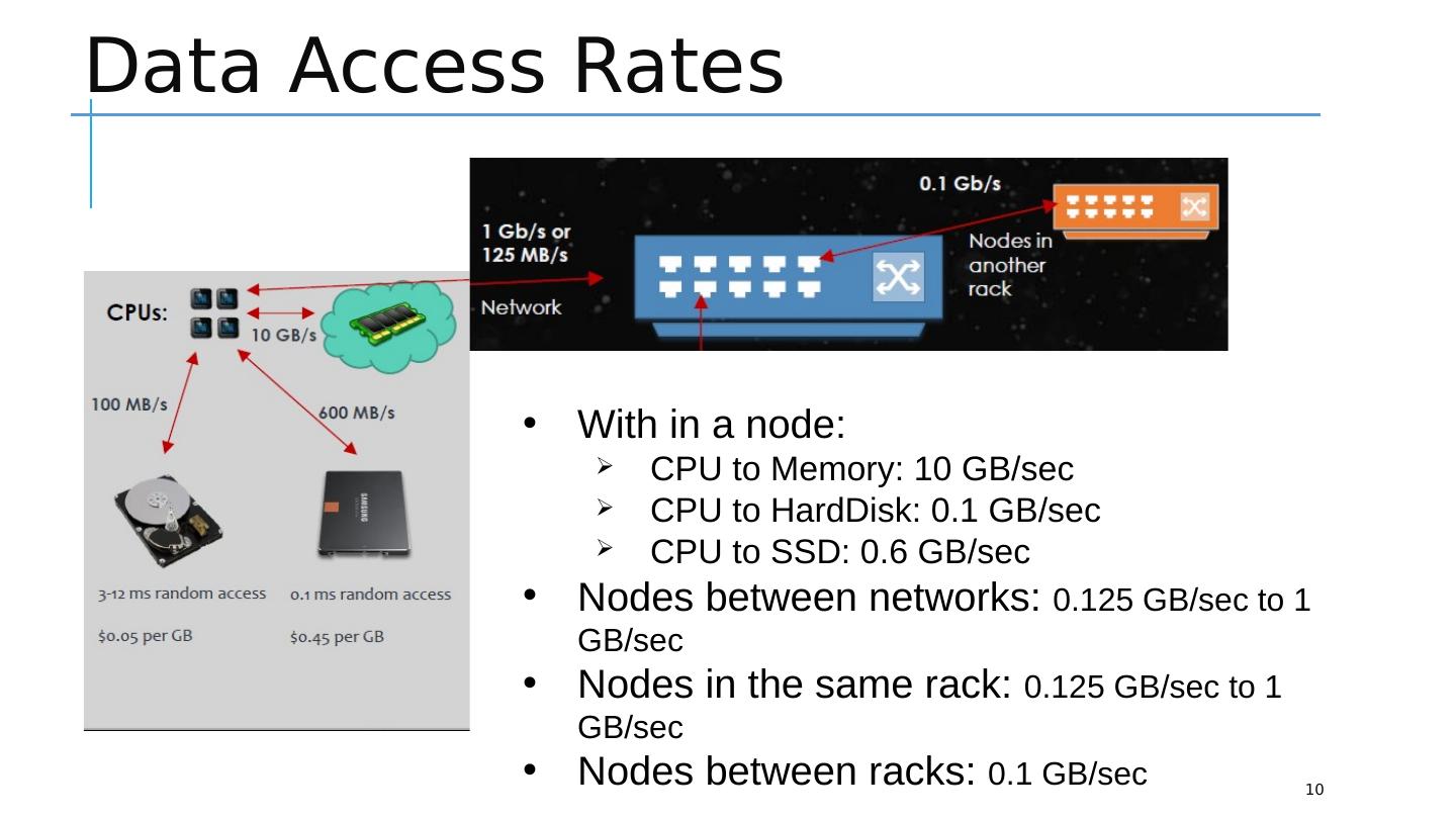 10 .Data Access Rates 10 With in a node: CPU to Memory: 10 GB/sec CPU to HardDisk : 0.1 GB/sec CPU to SSD: 0.6 GB/sec Nodes between networks: 0.125 GB/sec to 1 GB/sec Nodes in the same rack: 0.125 GB/sec to 1 GB/sec Nodes between racks: 0.1 GB/sec