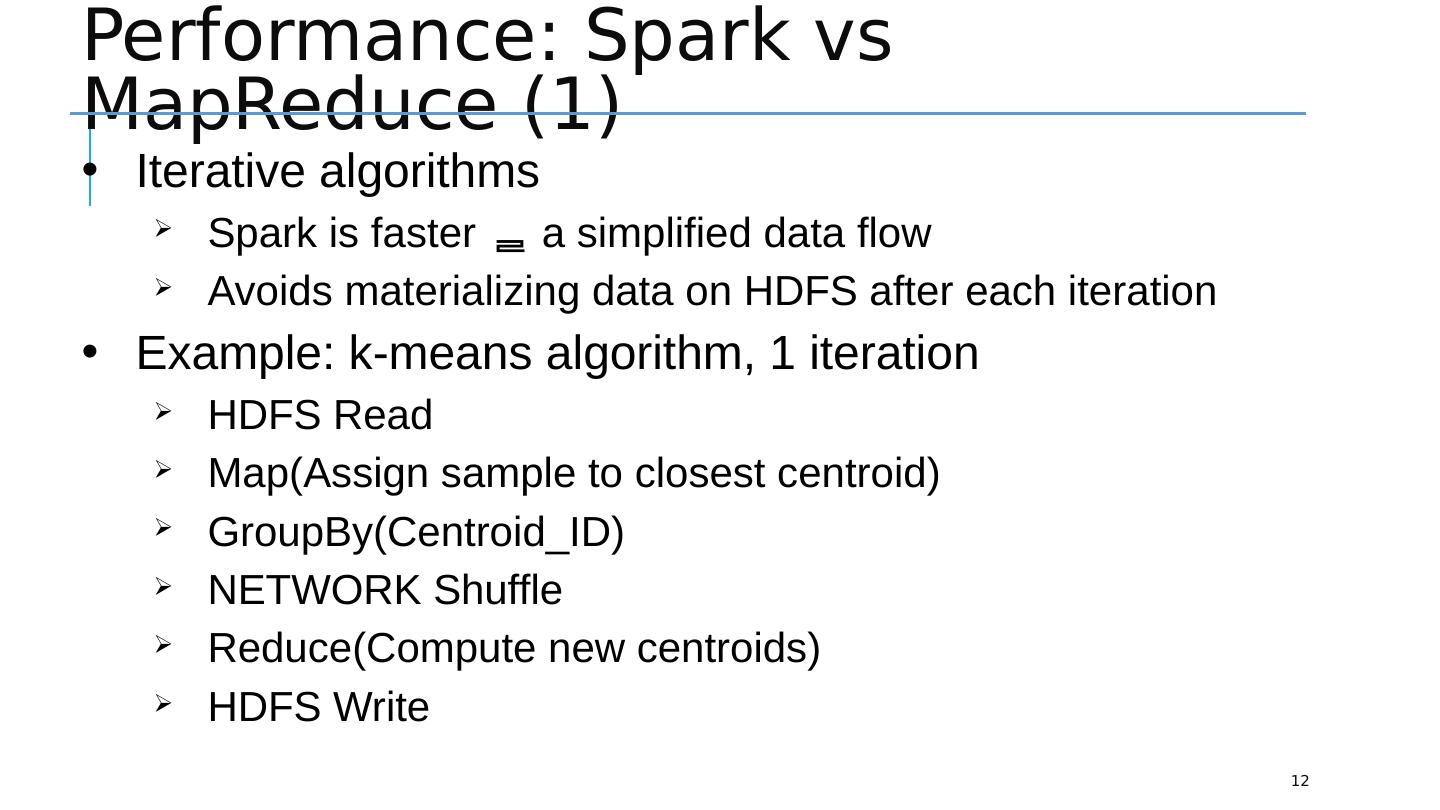12 .Performance: Spark vs MapReduce (1) 12 Iterative algorithms Spark is faster a simplified data flow Avoids materializing data on HDFS after each iteration Example: k-means algorithm, 1 iteration HDFS Read Map(Assign sample to closest centroid) GroupBy ( Centroid_ID ) NETWORK Shuffle Reduce(Compute new centroids) HDFS Write