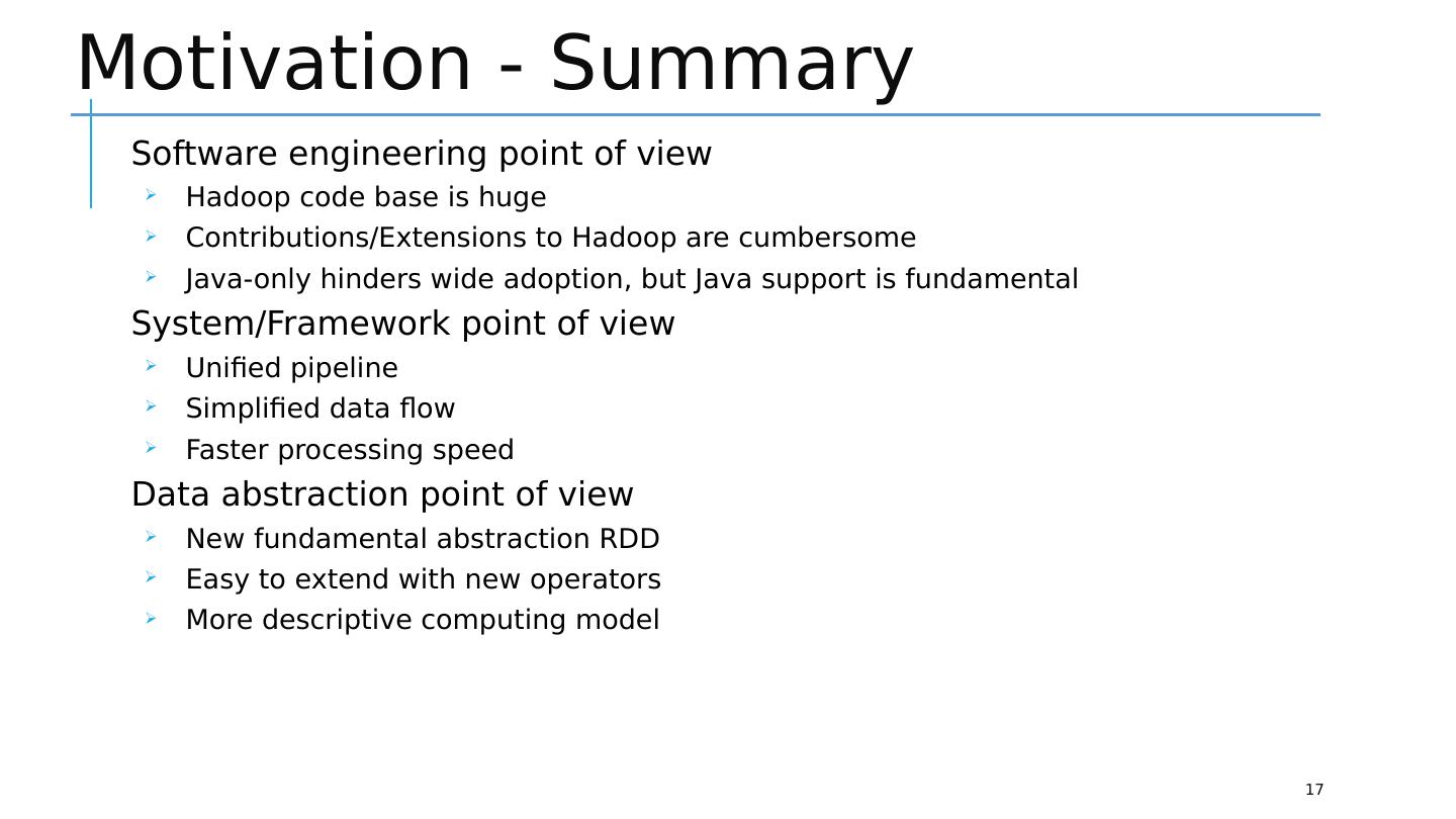 17 .Motivation - Summary 17 Software engineering point of view Hadoop code base is huge Contributions/Extensions to Hadoop are cumbersome Java-only hinders wide adoption, but Java support is fundamental System/Framework point of view Unified pipeline Simplified data flow Faster processing speed Data abstraction point of view New fundamental abstraction RDD Easy to extend with new operators More descriptive computing model