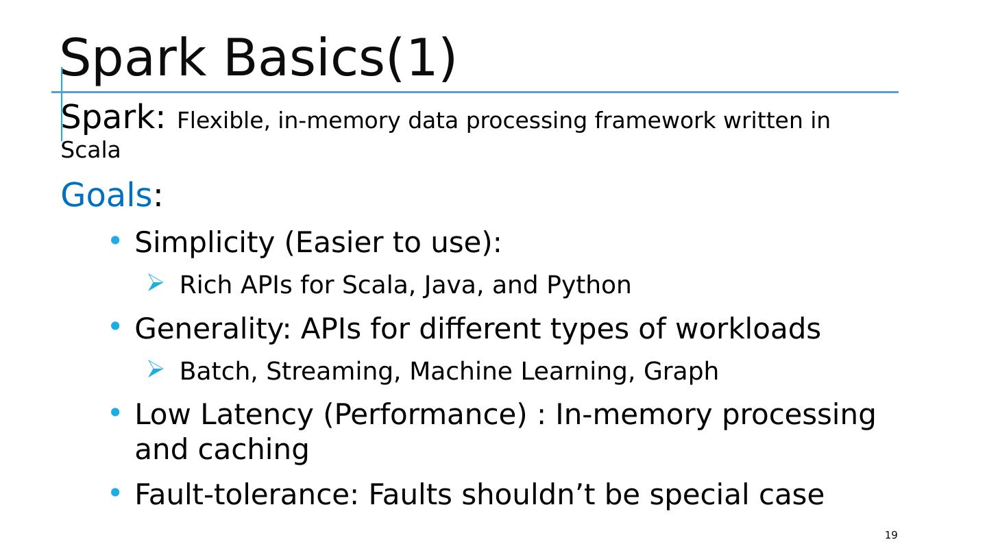 19 .Spark Basics(1) 19 Spark: Flexible, in-memory data processing framework written in Scala Goals : Simplicity (Easier to use): Rich APIs for Scala, Java, and Python Generality: APIs for different types of workloads Batch, Streaming, Machine Learning, Graph Low Latency (Performance) : In-memory processing and caching Fault-tolerance: Faults shouldn’t be special case