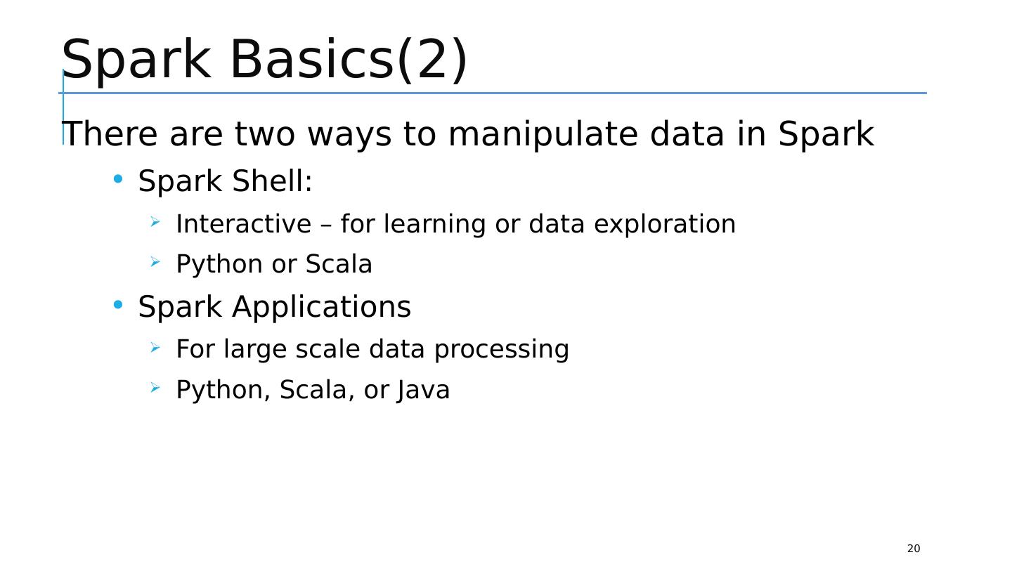 20 .Spark Basics(2) 20 There are two ways to manipulate data in Spark Spark Shell : Interactive – for learning or data exploration Python or Scala Spark Applications For large scale data processing Python, Scala, or Java