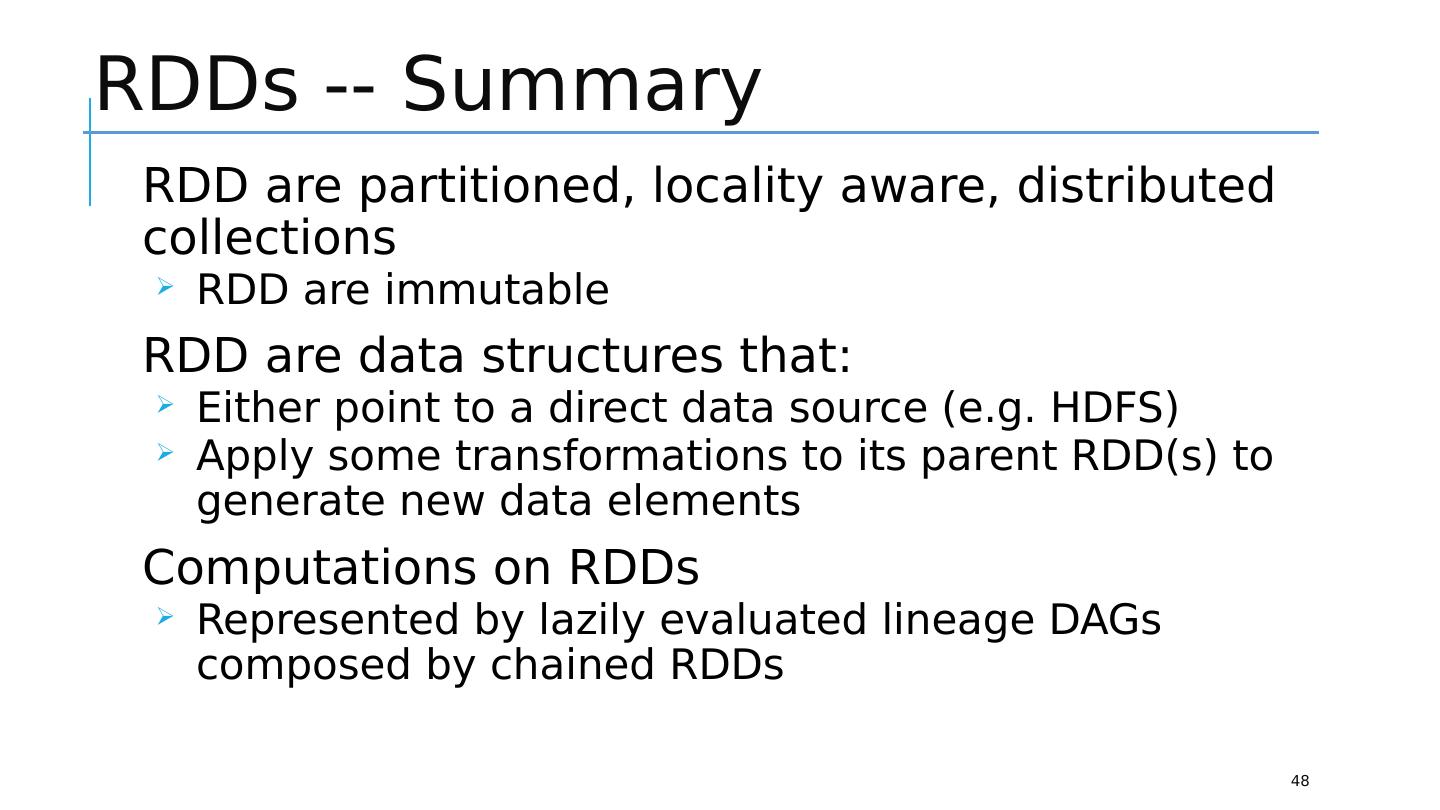 29 .Resilient Distributed Dataset 29 RDD (Resilient Distributed Dataset) is the fundamental unit of data in Spark : An Immutable collection of objects (or records, or elements) that can be operated on “in parallel” ( spread across a cluster) Resilient -- if data in memory is lost, it can be recreated Recover from node failures An RDD keeps its lineage information it can be recreated from parent RDDs Distributed -- processed across the cluster Each RDD is composed of one or more partitions (more partitions – more parallelism) Dataset -- initial data can come from a file or be created