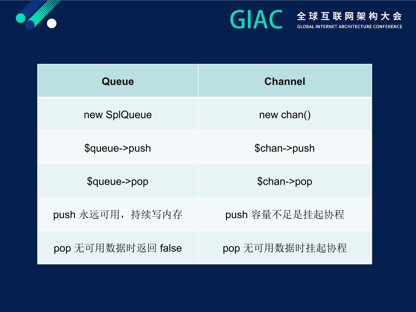 19 . Queue Channel new SplQueue new chan() $queue->push $chan->push $queue->pop $chan->pop push push pop false pop