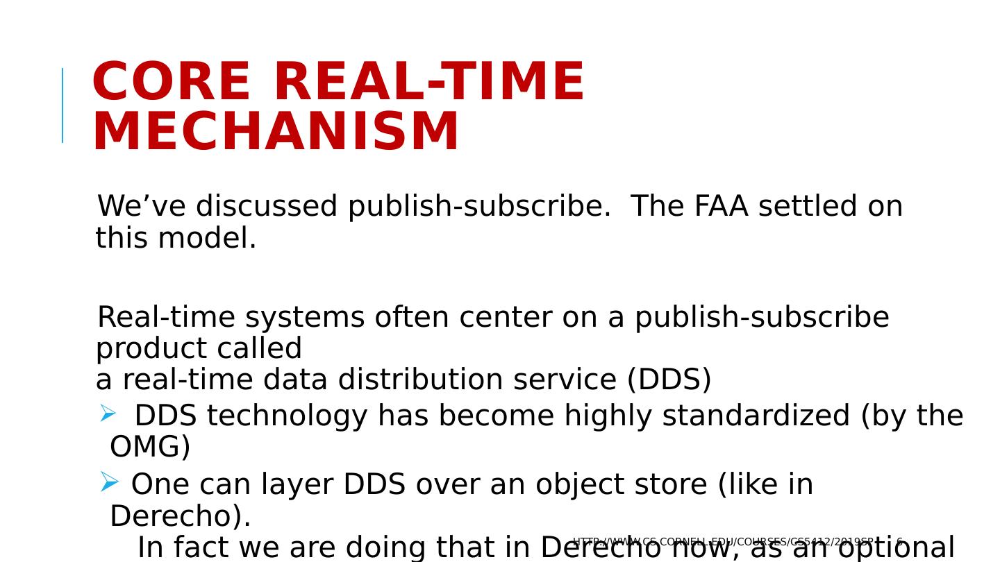 6 .Core Real-Time Mechanism We’ve discussed publish-subscribe. The FAA settled on this model. Real-time systems often center on a publish-subscribe product called a real-time data distribution service (DDS) DDS technology has become highly standardized (by the OMG) One can layer DDS over an object store (like in Derecho). In fact we are doing that in Derecho now, as an optional API. http://www.cs.cornell.edu/courses/cs5412/2019sp 6