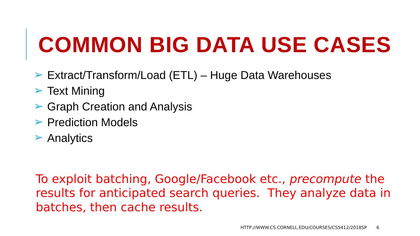6 .Common Big Data Use Cases Extract/Transform/Load (ETL) – Huge Data Warehouses Text Mining Graph Creation and Analysis Prediction Models Analytics HTTP://WWW.CS.CORNELL.EDU/COURSES/CS5412/2018SP 6 To exploit batching, Google/Facebook etc., precompute the results for anticipated search queries. They analyze data in batches, then cache results.