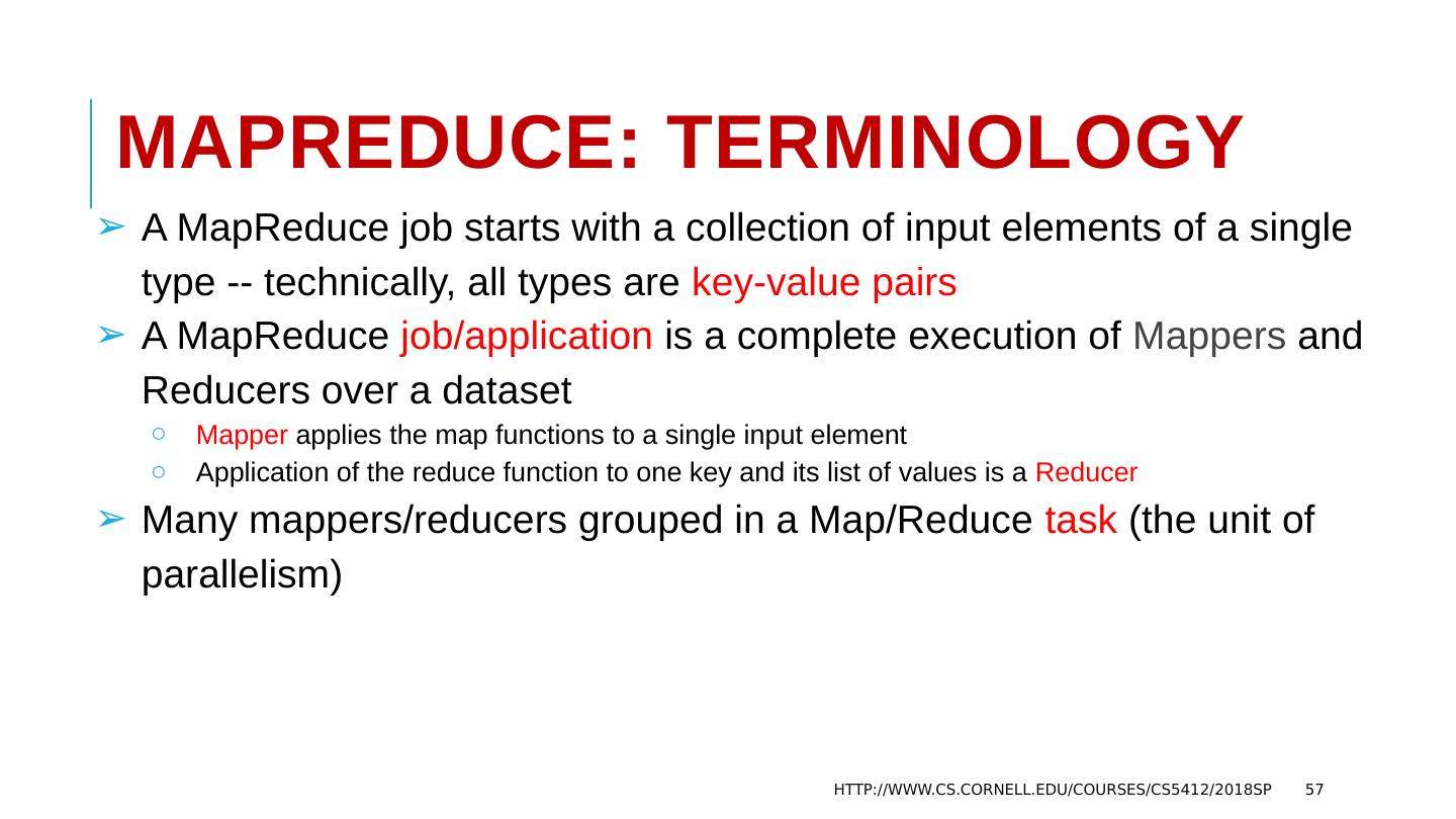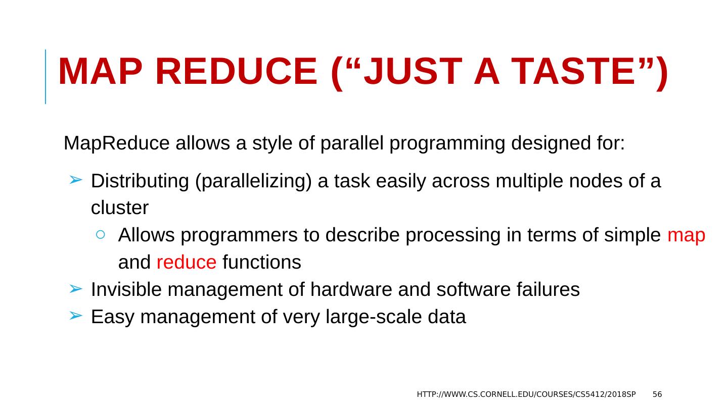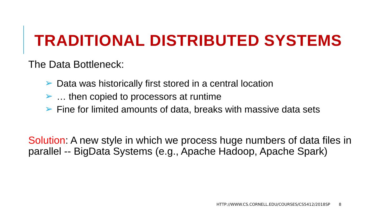 7 .Big Data Processing? Nature of the data forces us to use massive parallelism Recall: Huge Volumes, High Velocity, and Variety Traditional Single Server Systems are far to weak for processing petabytes of data – insufficient compute and storage The only option: Distribute data, obtain parallelism with multiple servers HTTP://WWW.CS.CORNELL.EDU/COURSES/CS5412/2018SP 7