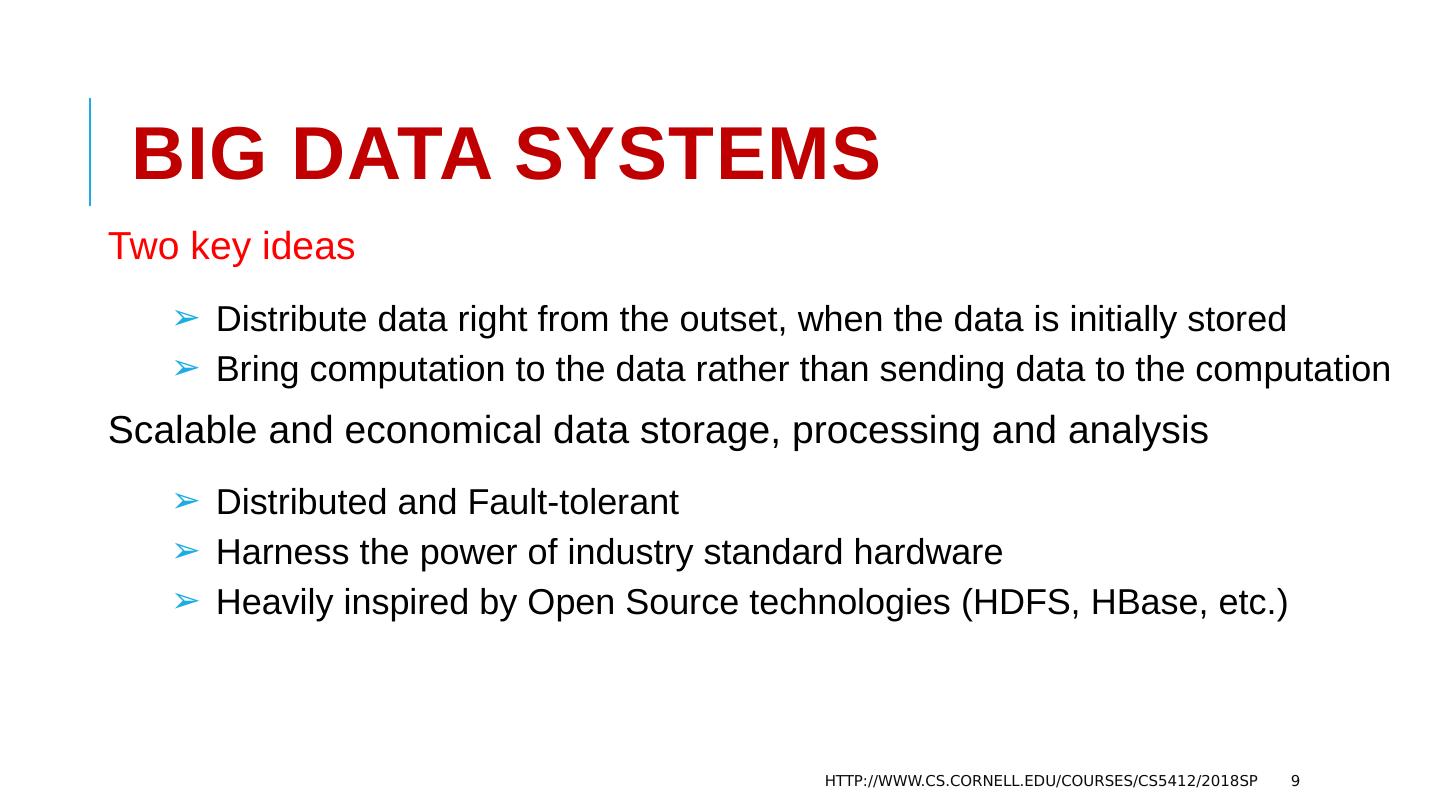 9 .Big Data Systems Two key ideas Distribute data right from the outset, when the data is initially stored Bring computation to the data rather than sending data to the computation Scalable and economical data storage, processing and analysis Distributed and Fault-tolerant Harness the power of industry standard hardware Heavily inspired by Open Source technologies (HDFS, HBase , etc.) HTTP://WWW.CS.CORNELL.EDU/COURSES/CS5412/2018SP 9
