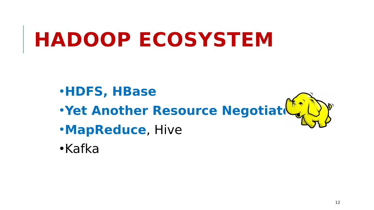 12 .Hadoop Ecosystem 12 HDFS, HBase Yet Another Resource Negotiator MapReduce , Hive Kafka