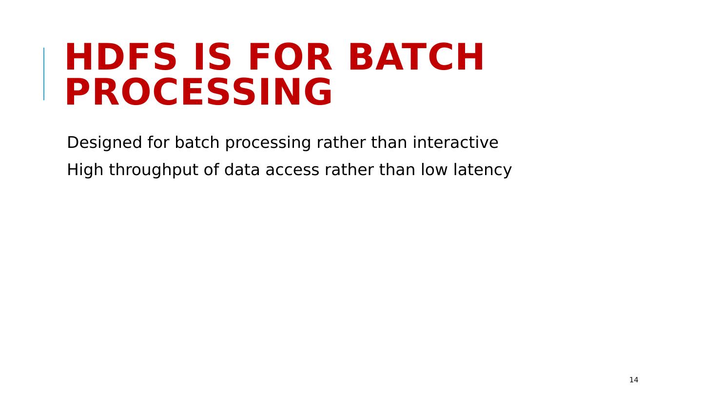 14 .HDFS is for Batch Processing Designed for batch processing rather than interactive High throughput of data access rather than low latency 14
