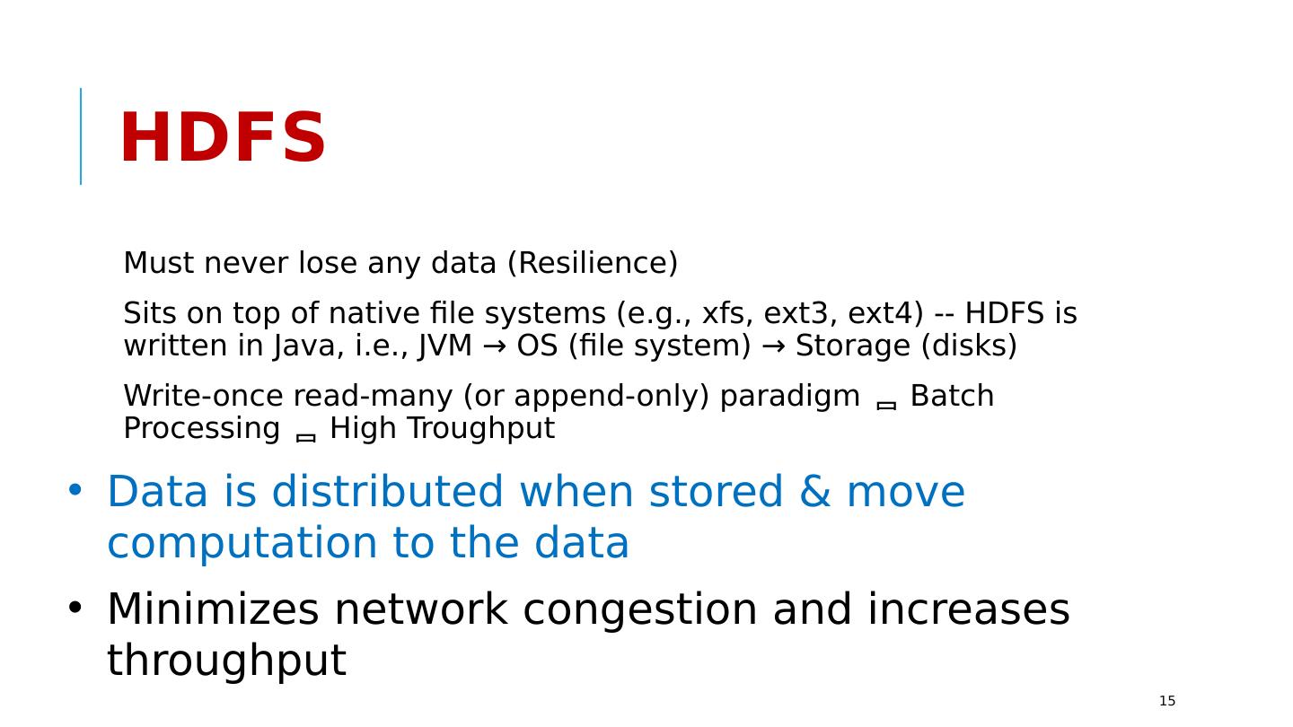 15 .HDFS Must never lose any data (Resilience) Sits on top of native file systems (e.g., xfs, ext3, ext4) -- HDFS is written in Java, i.e., JVM → OS (file system) → Storage (disks) Write-once read-many (or append-only) paradigm Batch Processing High Troughput 15 Data is distributed when stored & move computation to the data Minimizes network congestion and increases throughput