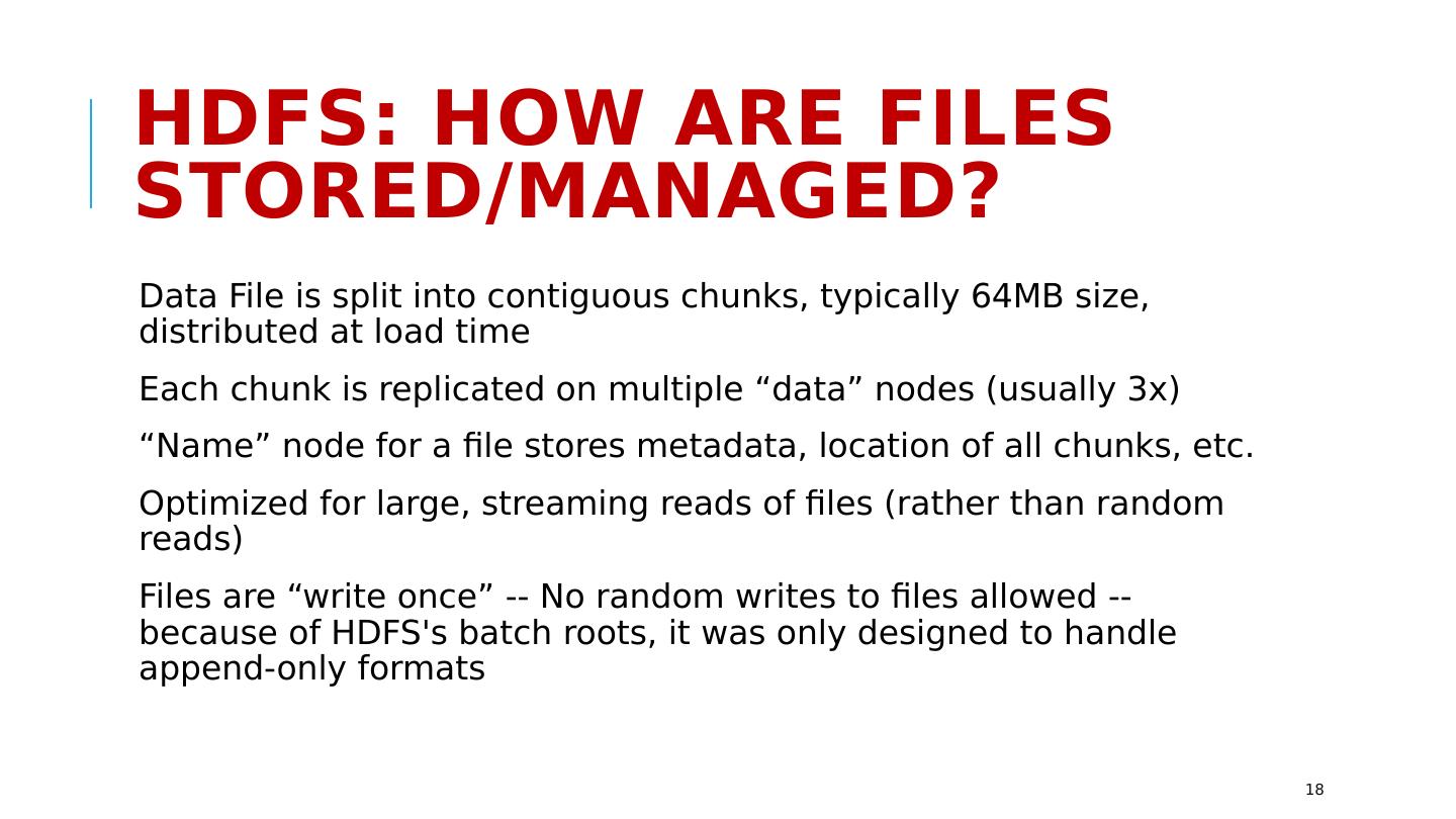 17 .HDFS: Architecture Master/slave architecture: NameNode (the master process -- one per cluster) Availability of Name Node is critical -- single point of failure? The NameNode executes file system namespace operations such as opening, closing etc. The DataNodes (slaves) are responsible for serving read and write requests from the file system’s clients 17 Image source: https://hadoop.apache.org/docs/r1.2.1/hdfs_design.html