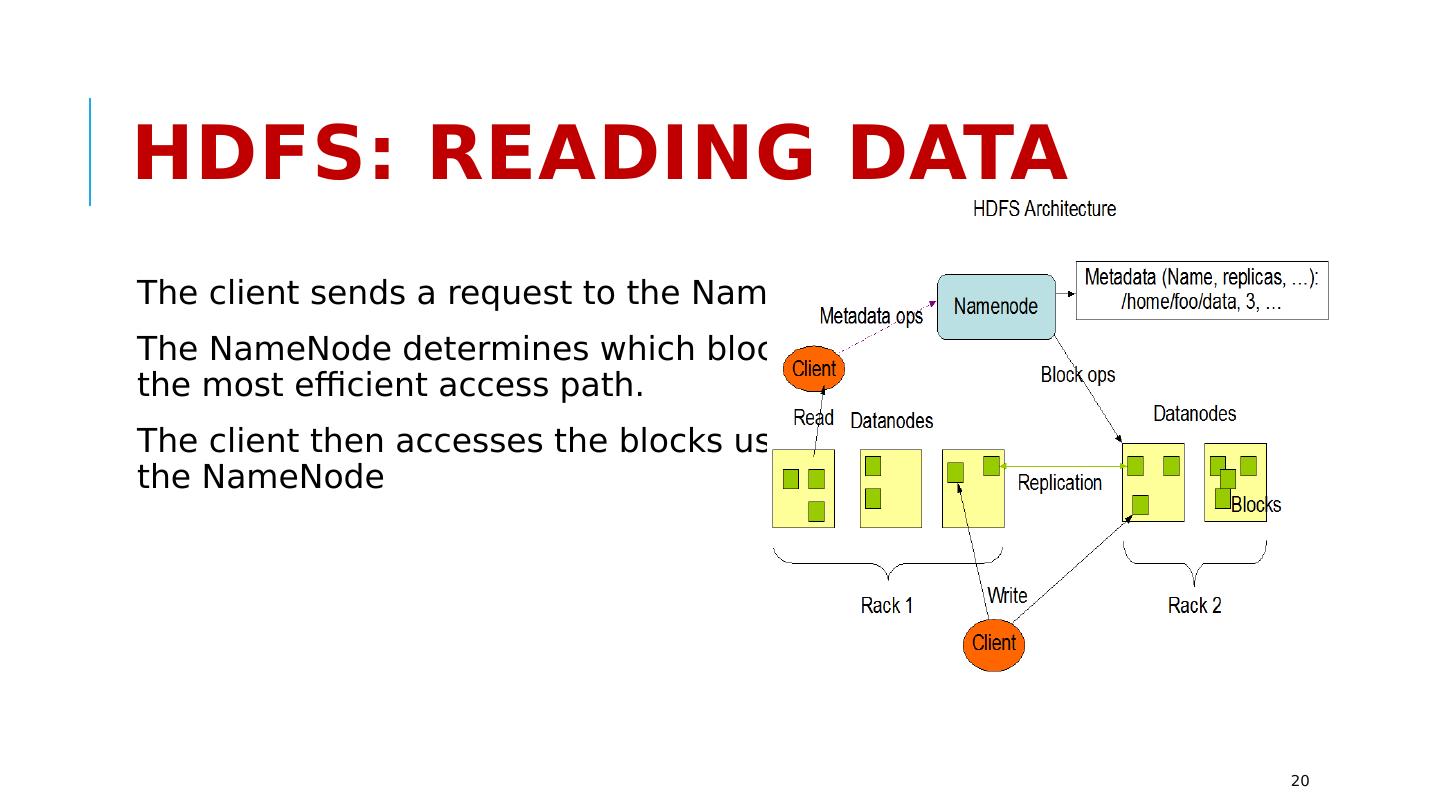 20 .HDFS: Reading Data The client sends a request to the NameNode for a file. The NameNode determines which blocks are involved and chooses the most efficient access path. The client then accesses the blocks using the addresses given by the NameNode 20