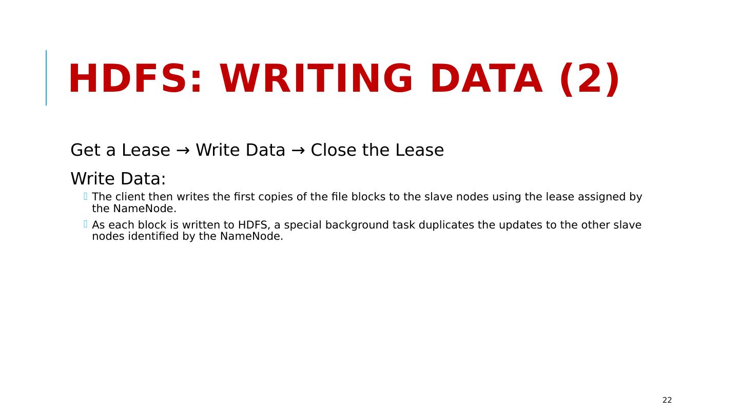 21 .HDFS: Writing Data (1) Get a Lease → Write Data → Close the Lease Getting Lease: The client sends a request to the NameNode to create a new file. The NameNode determines how many blocks are needed, and the client is granted a lease for creating these new file blocks in the cluster. 21