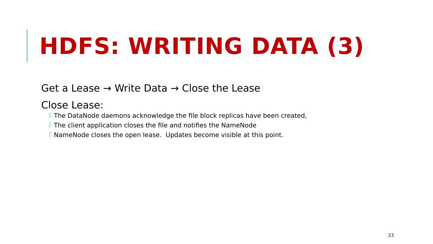 23 .HDFS: Writing Data (3) Get a Lease → Write Data → Close the Lease Close Lease: The DataNode daemons acknowledge the file block replicas have been created, The client application closes the file and notifies the NameNode NameNode closes the open lease. Updates become visible at this point. 23