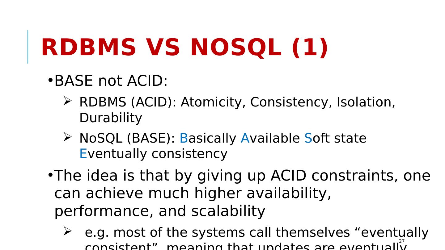 27 .RDBMS vs NoSQL (1) 27 BASE not ACID: RDBMS (ACID): Atomicity, Consistency, Isolation, Durability NoSQL (BASE): B asically A vailable S oft state E ventually consistency The idea is that by giving up ACID constraints, one can achieve much higher availability, performance, and scalability e.g. most of the systems call themselves “eventually consistent”, meaning that updates are eventually propagated to all nodes
