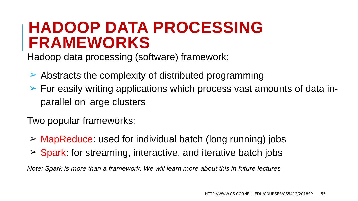 2 .PUTTING IT ALL TOGETHER We have seen a great deal of the structure at the edge of the cloud, and how it might “talk” to data sources of various kinds. Tasks like machine learning and “big data” analytics occur at the back. How are these connected together? Some tier two -services store data into files or append-only logs Periodically (delay depends on the use) we process in batches. … we batch the operations because of the massive scale. … idea is to compute “once” but answer many questions! HTTP://WWW.CS.CORNELL.EDU/COURSES/CS5412/2018SP 2