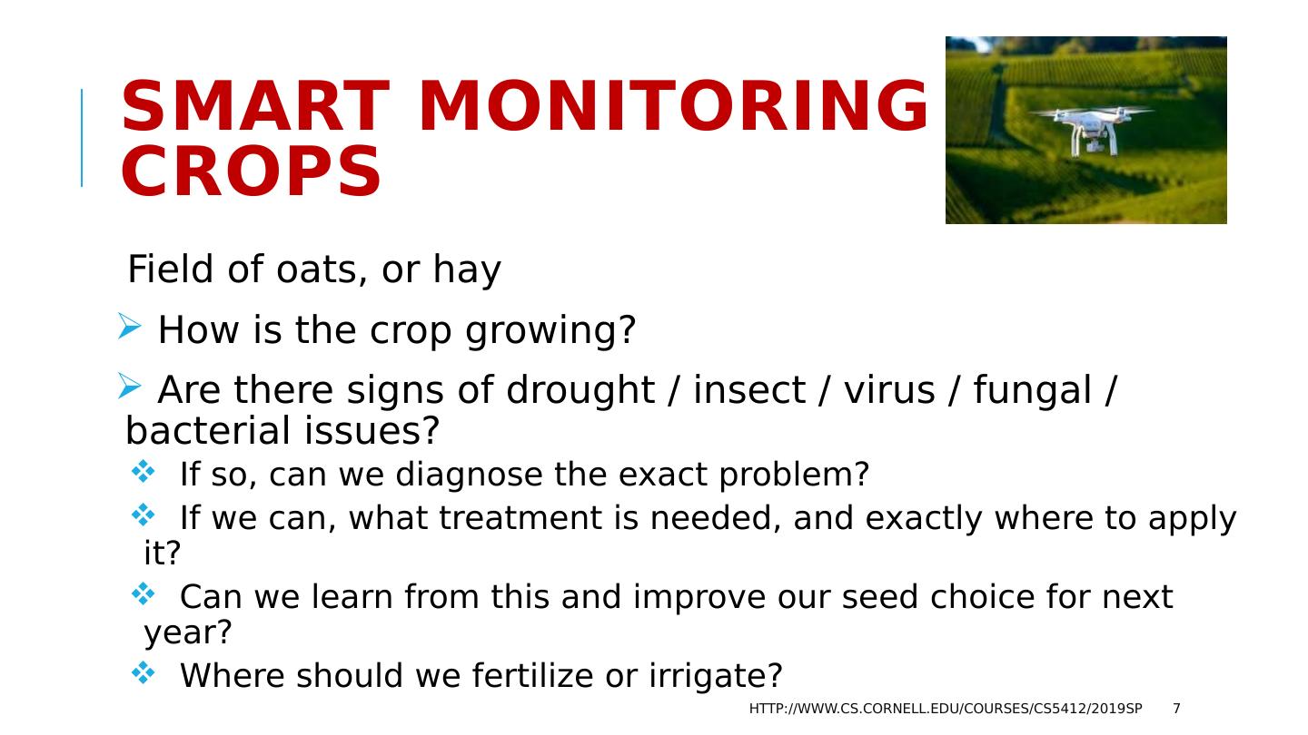 7 .Smart monitoring of Crops Field of oats, or hay How is the crop growing? Are there signs of drought / insect / virus / fungal / bacterial issues? If so, can we diagnose the exact problem? If we can, what treatment is needed, and exactly where to apply it? Can we learn from this and improve our seed choice for next year? Where should we fertilize or irrigate? http://www.cs.cornell.edu/courses/cs5412/2019sp 7