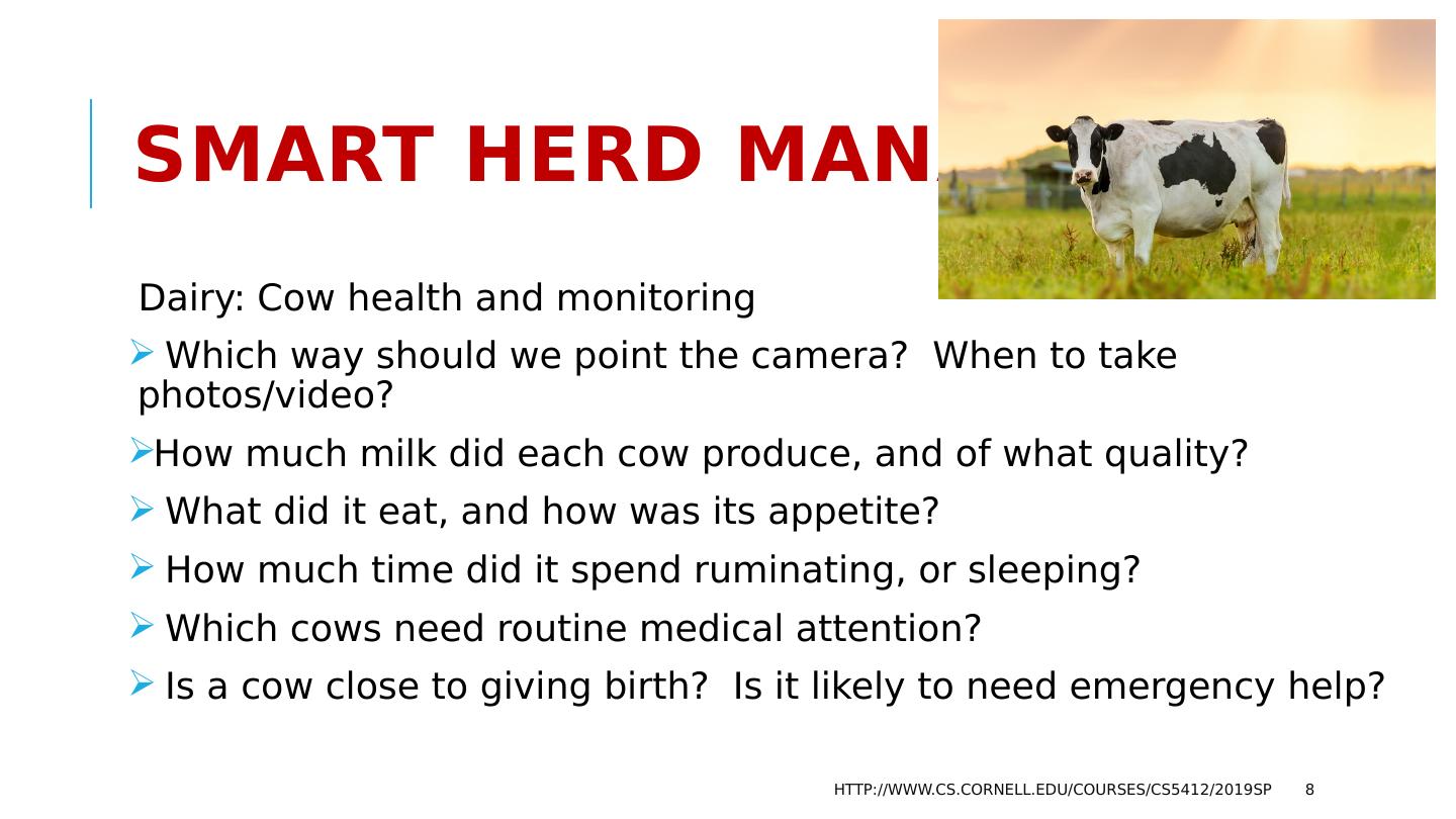 8 .Smart herd management Dairy: Cow health and monitoring Which way should we point the camera? When to take photos/video? How much milk did each cow produce, and of what quality? What did it eat, and how was its appetite? How much time did it spend ruminating, or sleeping? Which cows need routine medical attention? Is a cow close to giving birth? Is it likely to need emergency help? http://www.cs.cornell.edu/courses/cs5412/2019sp 8