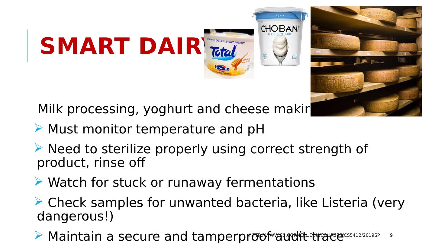 9 .Smart Dairy Milk processing, yoghurt and cheese making Must monitor temperature and pH Need to sterilize properly using correct strength of product, rinse off Watch for stuck or runaway fermentations Check samples for unwanted bacteria, like Listeria (very dangerous!) Maintain a secure and tamperproof audit trace ( BlockChain ?) http://www.cs.cornell.edu/courses/cs5412/2019sp 9