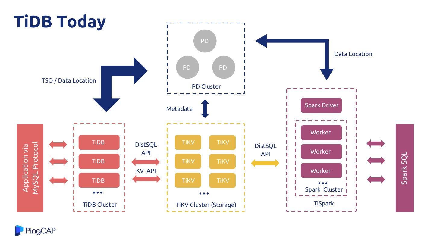 13 .TiDB Today PD Data Location PD PD TSO / Data Location PD Cluster Spark Driver Metadata Worker TiDB DistSQL TiKV TiKV MySQL Protocol DistSQL Application via API API Worker Spark SQL TiDB TiKV TiKV KV API Worker TiDB TiKV TiKV ... ... ... Spark Cluster TiDB Cluster TiKV Cluster (Storage) TiSpark